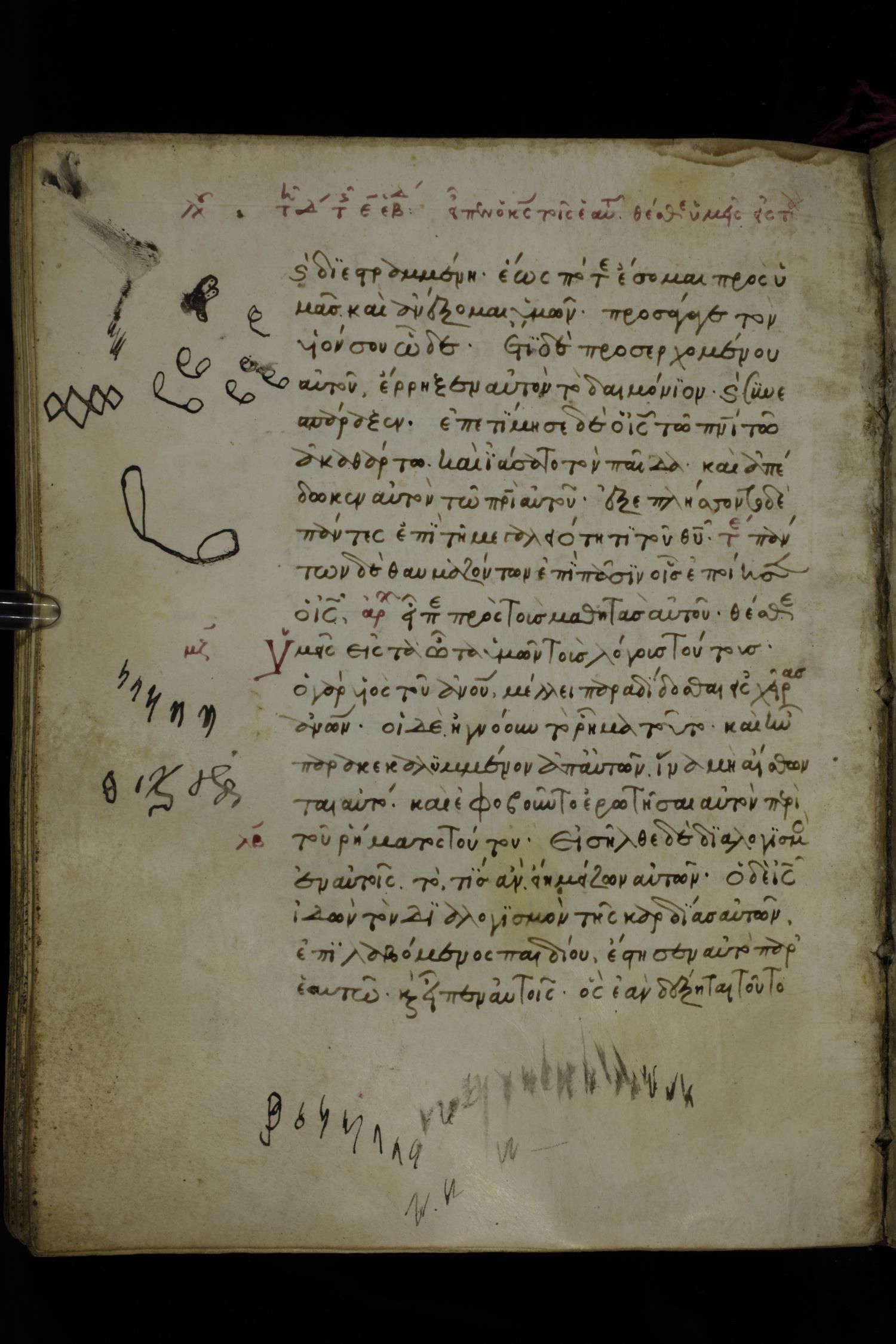 Fourteenth century minuscule of the Gospels on parchment; 250 leaves, 1 column, 20-21 lines per column. Images were taken at the National Library of Greece in Athens.