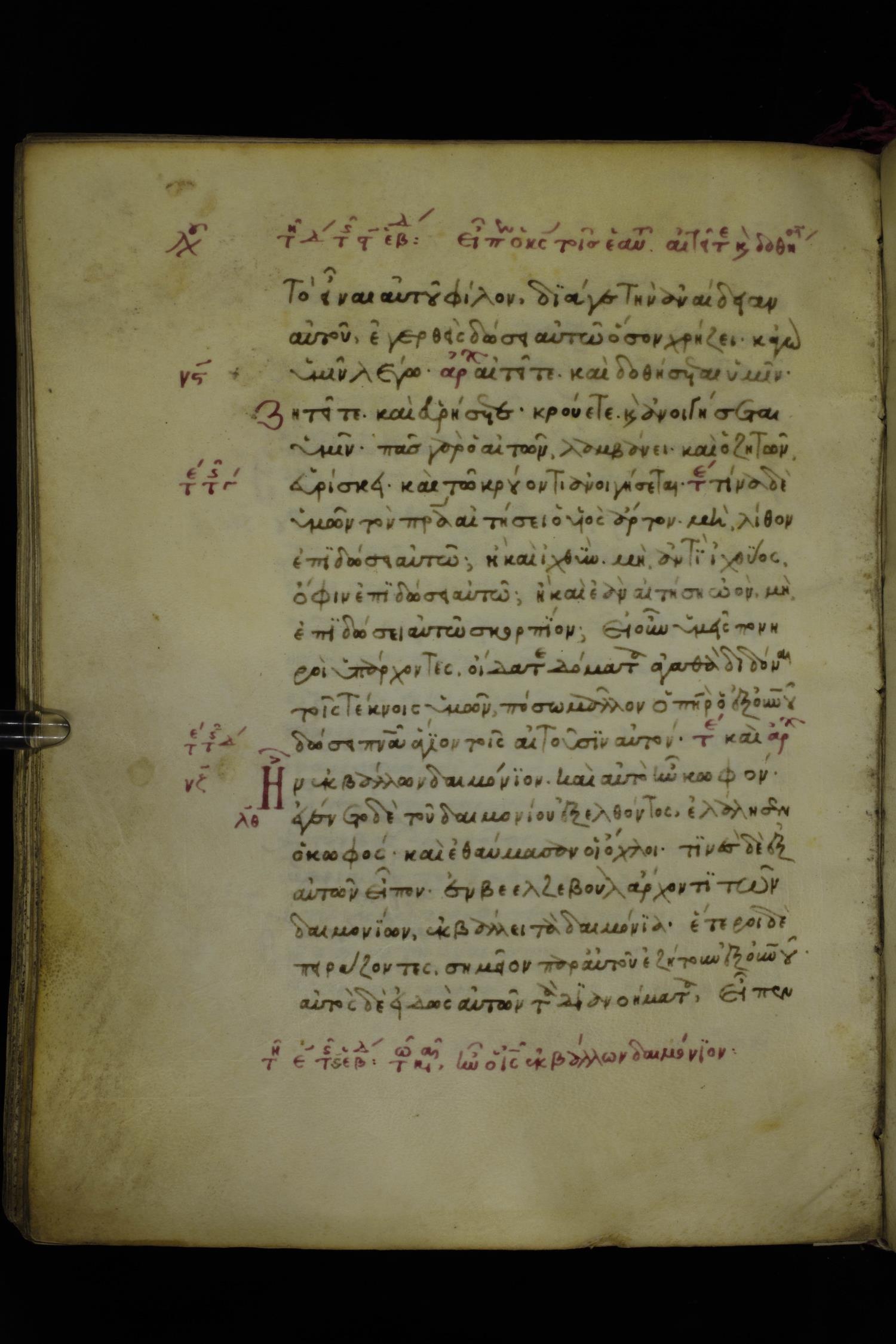 Fourteenth century minuscule of the Gospels on parchment; 250 leaves, 1 column, 20-21 lines per column. Images were taken at the National Library of Greece in Athens.