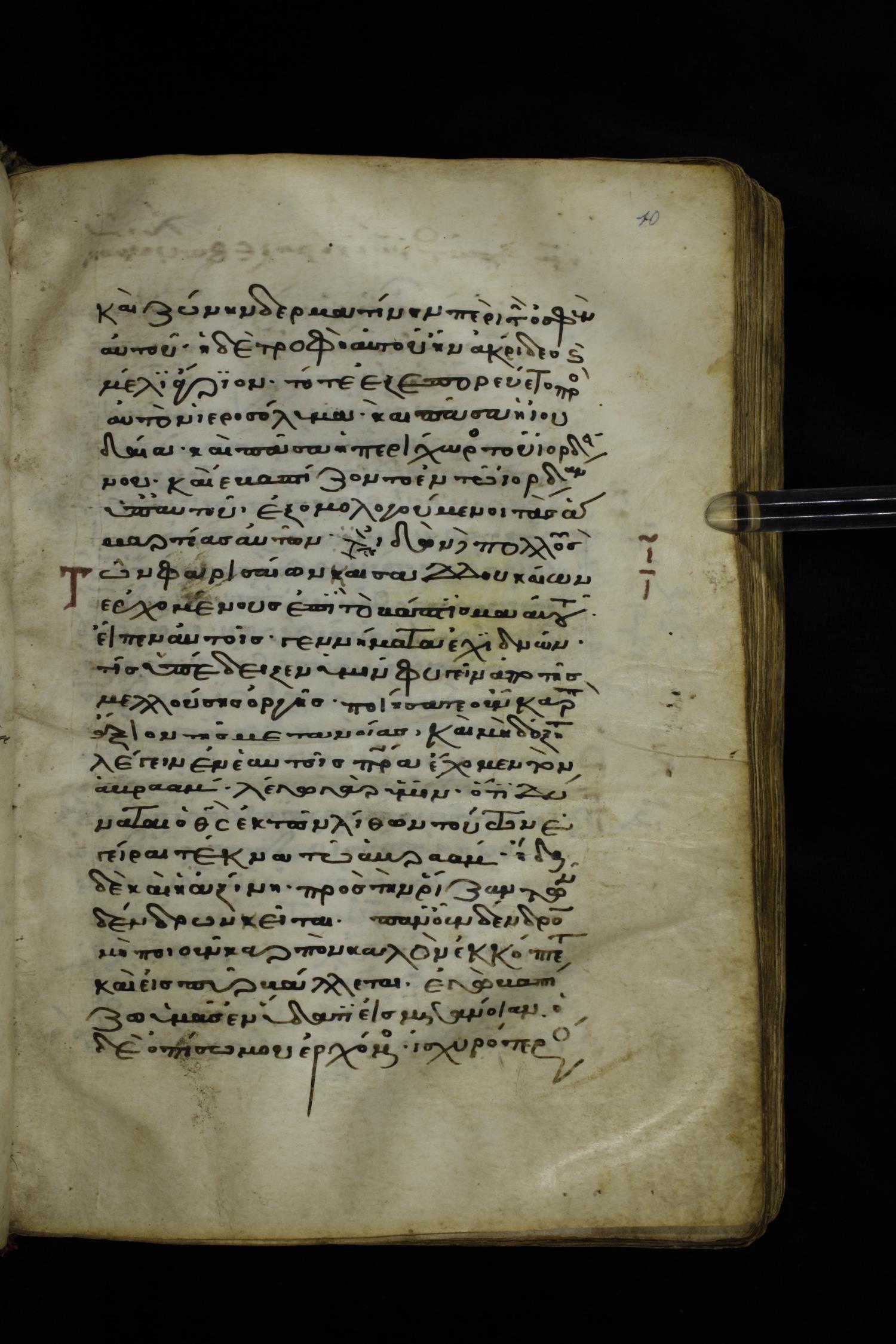 Twelfth or thirteenth century minuscule of the Gospels on parchment; 229 leaves, 1 column, 24-26 lines per column. Images were taken at the National Library of Greece in Athens.