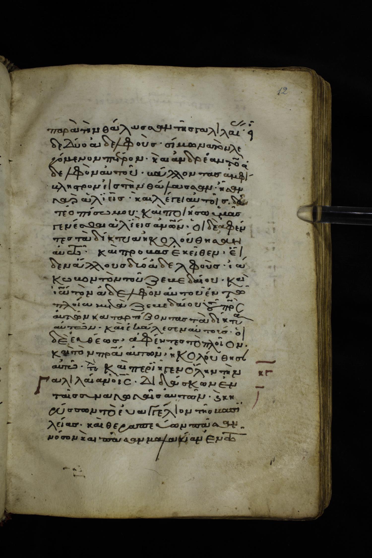 Twelfth or thirteenth century minuscule of the Gospels on parchment; 229 leaves, 1 column, 24-26 lines per column. Images were taken at the National Library of Greece in Athens.