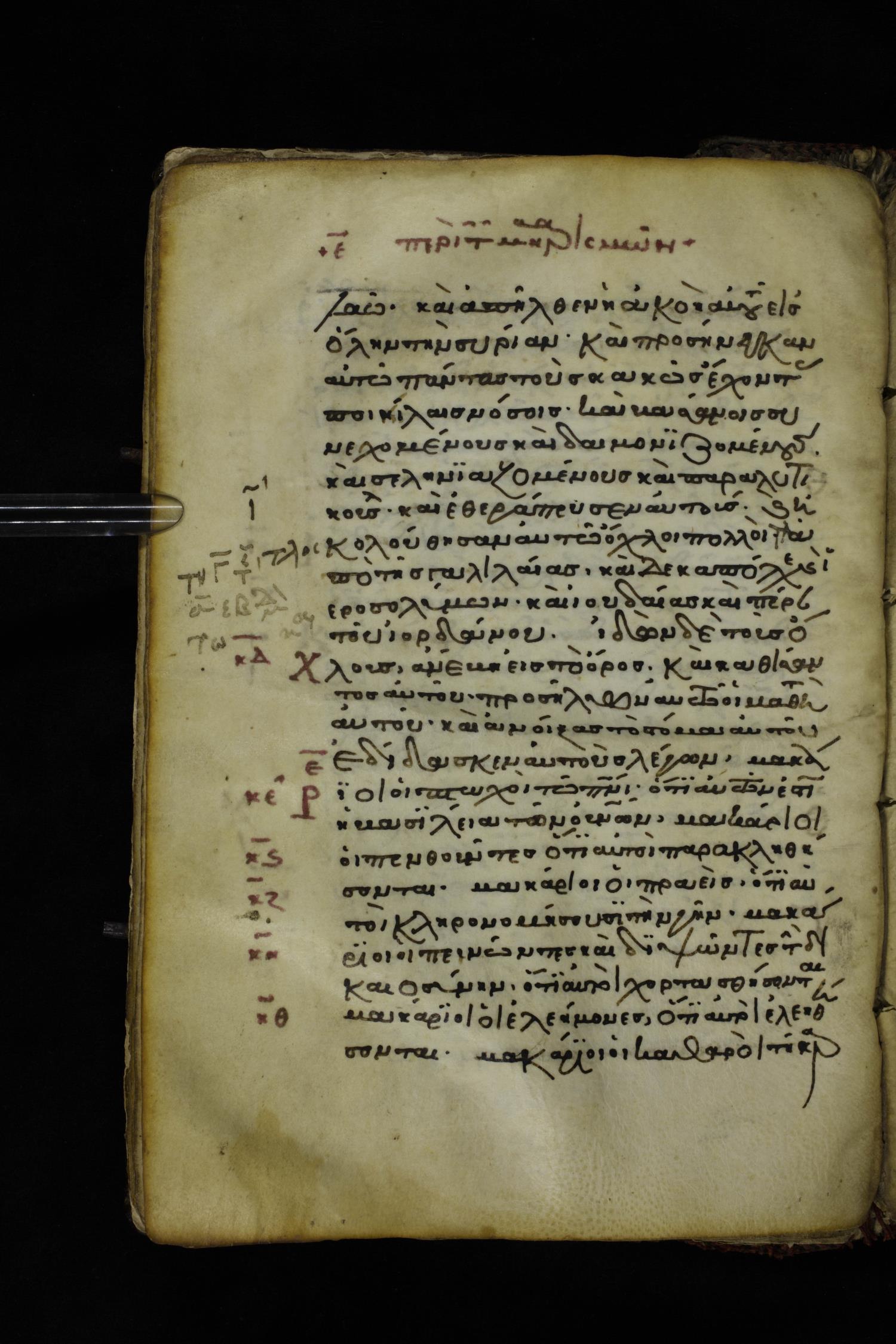 Twelfth or thirteenth century minuscule of the Gospels on parchment; 229 leaves, 1 column, 24-26 lines per column. Images were taken at the National Library of Greece in Athens.
