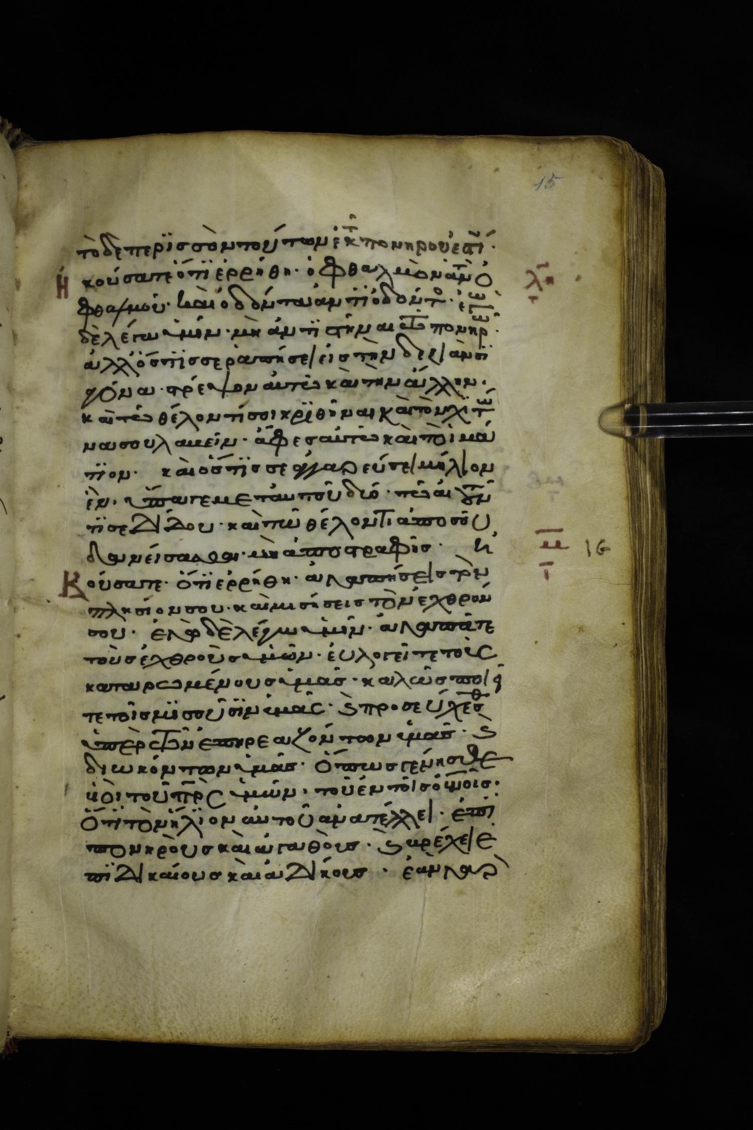 Twelfth or thirteenth century minuscule of the Gospels on parchment; 229 leaves, 1 column, 24-26 lines per column. Images were taken at the National Library of Greece in Athens.