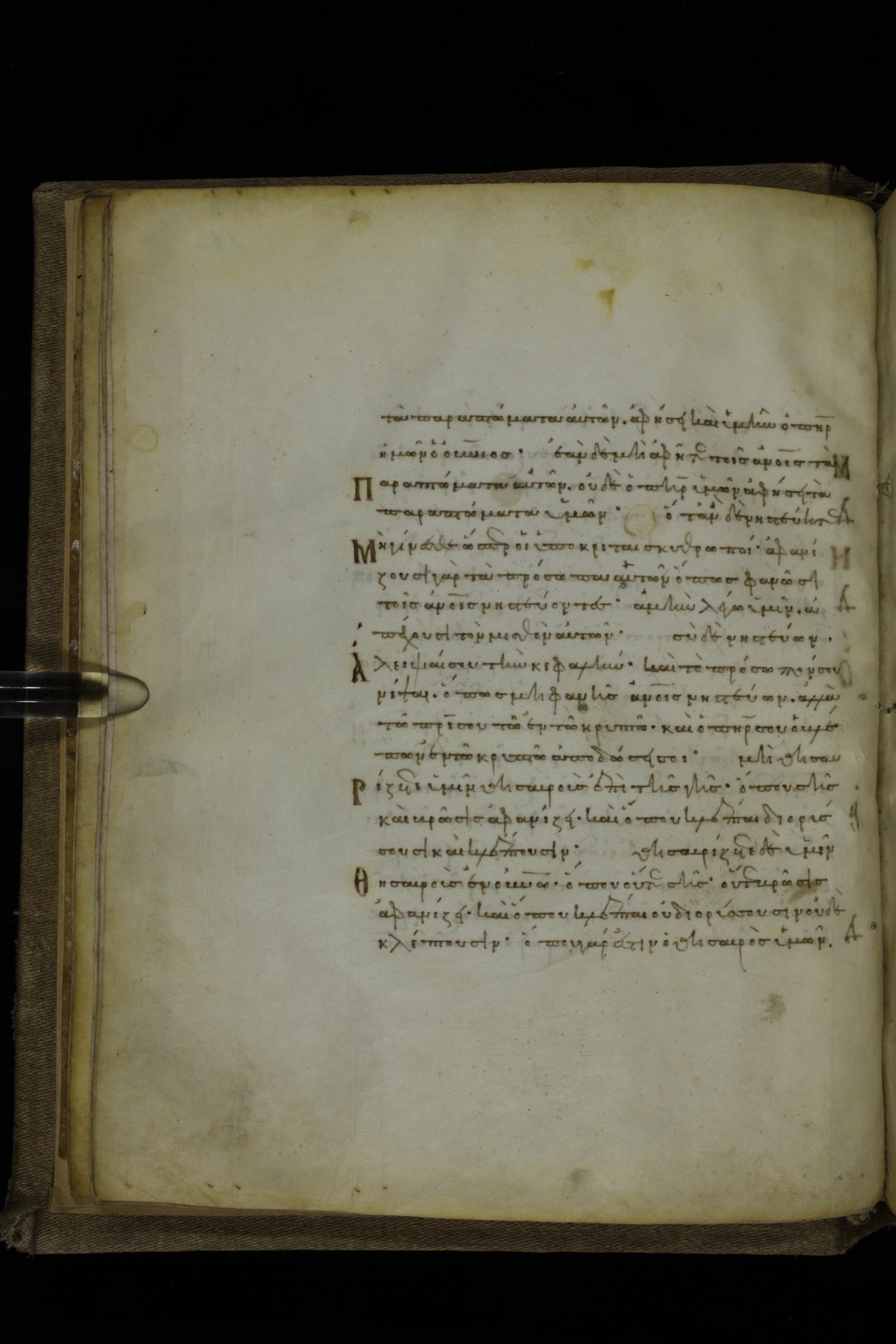 Twelfth century minuscule of the Gospels on parchment; 252 leaves, 1 column, 18 lines per column. Images were taken at the National Library of Greece in Athens.