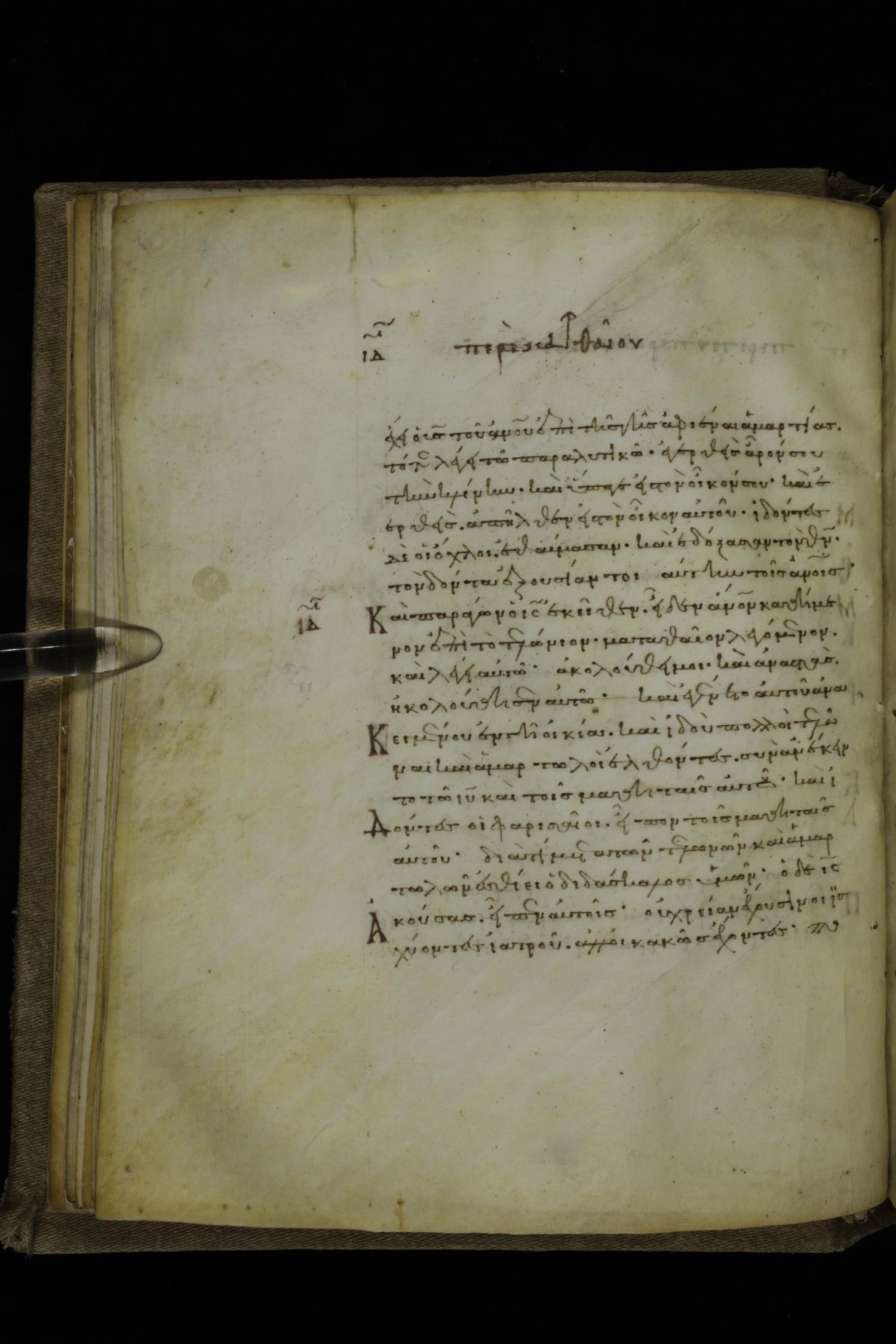 Twelfth century minuscule of the Gospels on parchment; 252 leaves, 1 column, 18 lines per column. Images were taken at the National Library of Greece in Athens.