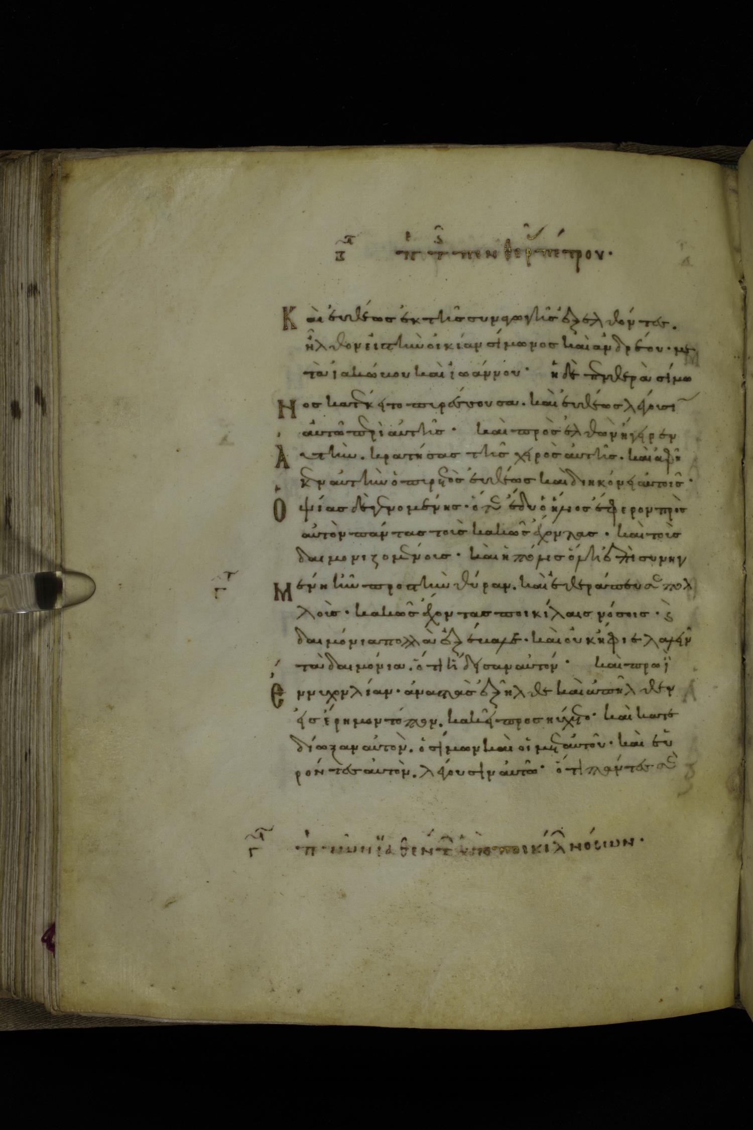 Twelfth century minuscule of the Gospels on parchment; 252 leaves, 1 column, 18 lines per column. Images were taken at the National Library of Greece in Athens.