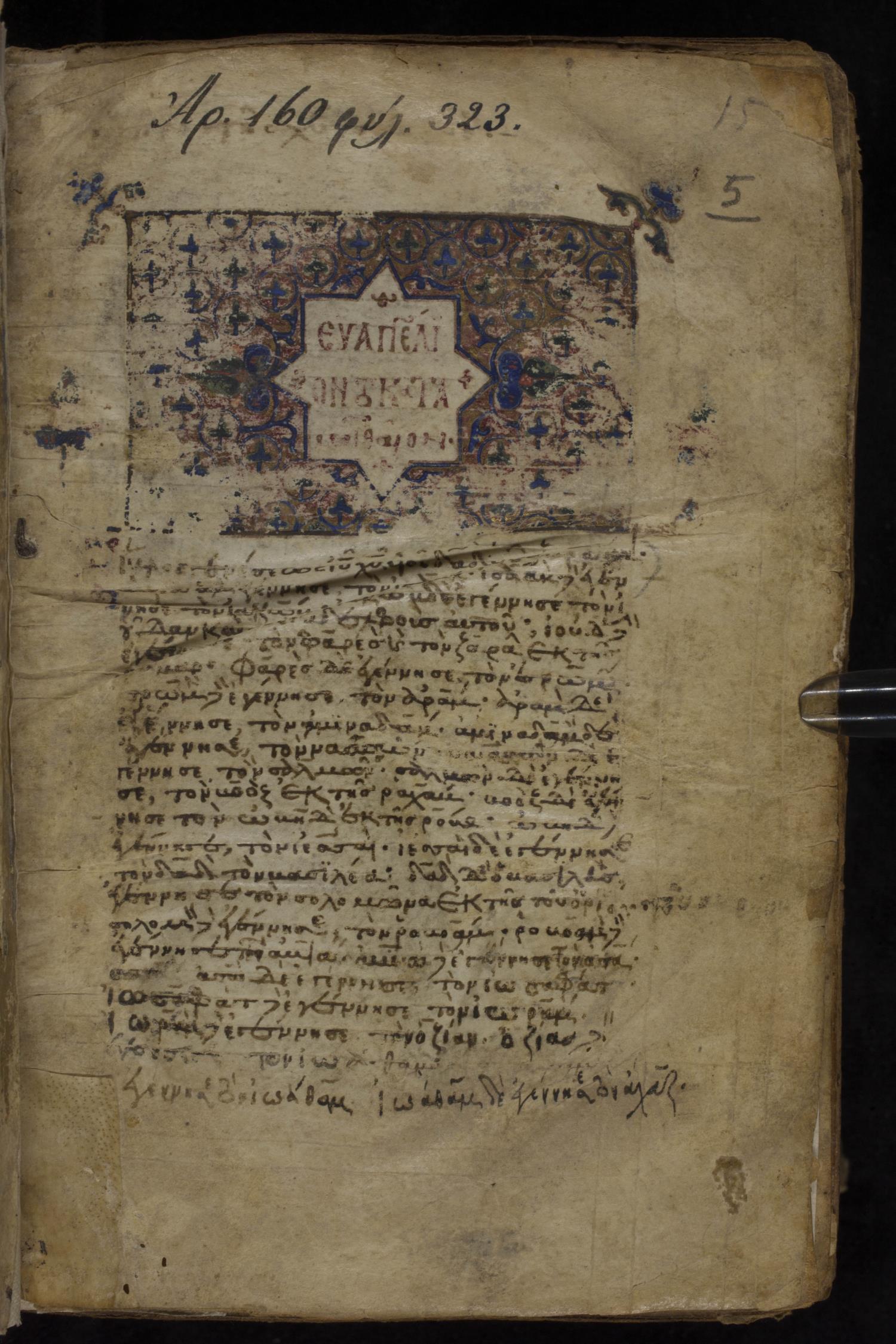 Eleventh century minuscule of the Gospels, the Apostolos, and Paul on parchment; 318 leaves, 1 column, 34 lines per column. Images were taken at the National Library of Greece in Athens.