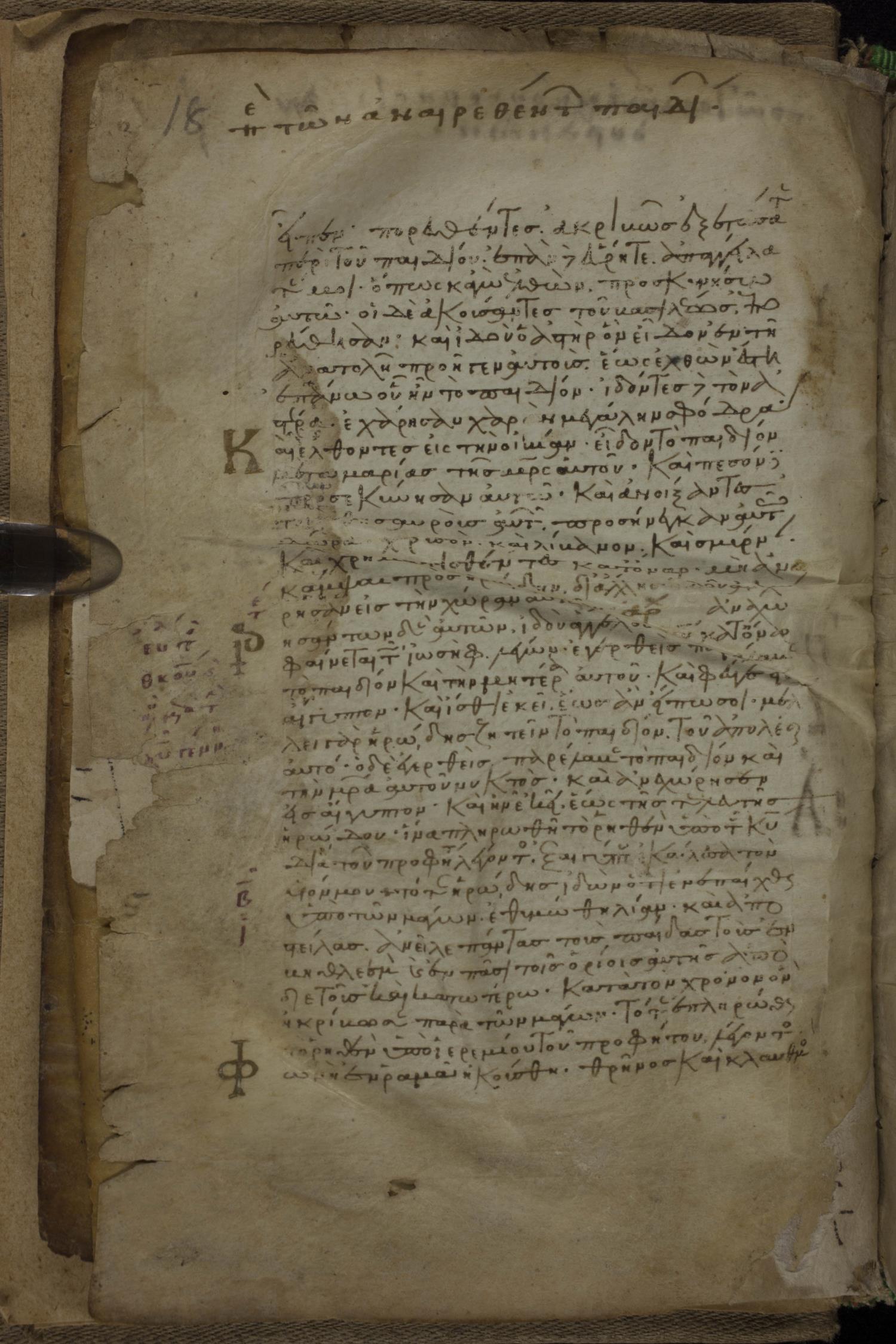 Eleventh century minuscule of the Gospels, the Apostolos, and Paul on parchment; 318 leaves, 1 column, 34 lines per column. Images were taken at the National Library of Greece in Athens.