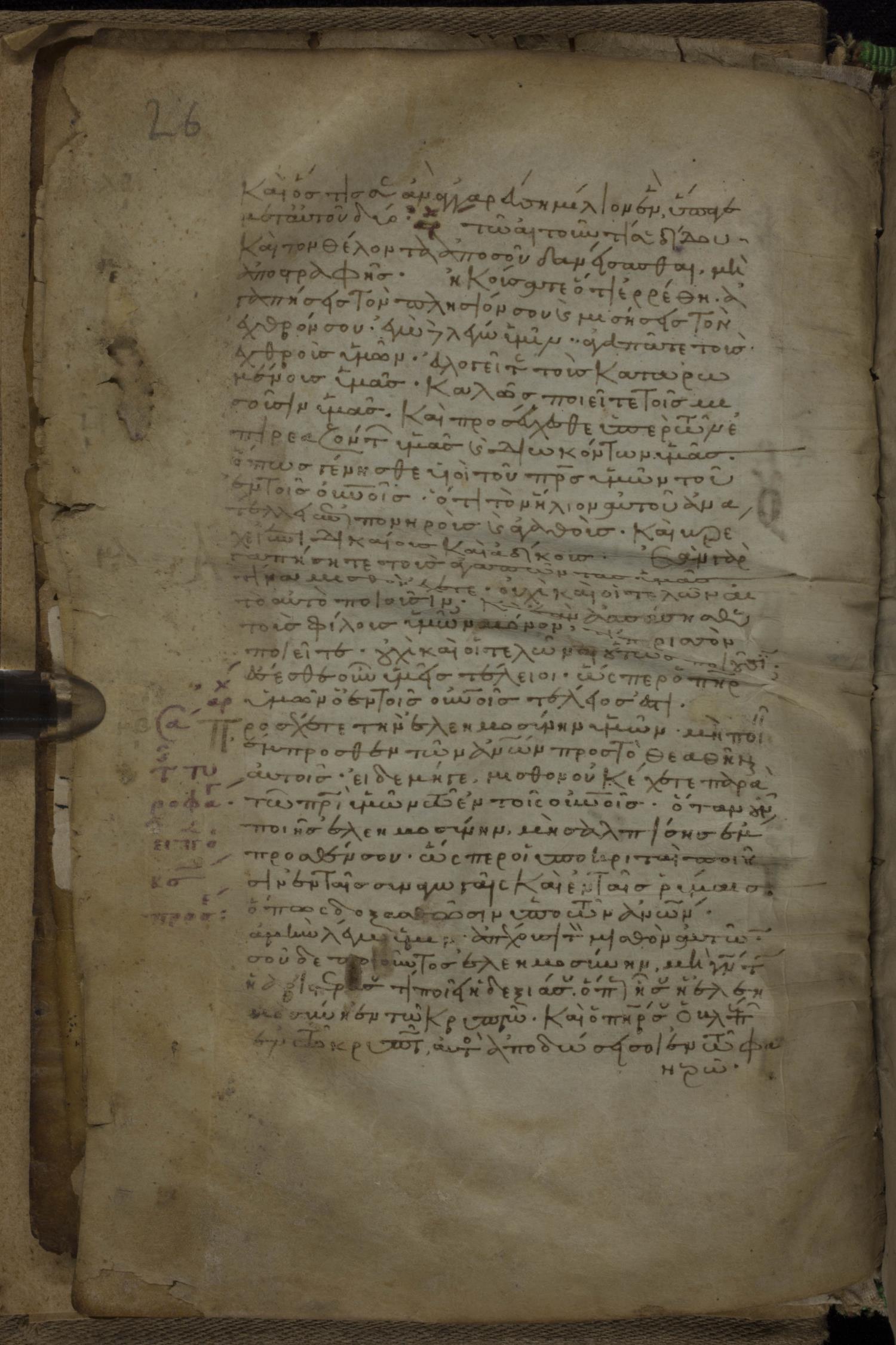 Eleventh century minuscule of the Gospels, the Apostolos, and Paul on parchment; 318 leaves, 1 column, 34 lines per column. Images were taken at the National Library of Greece in Athens.