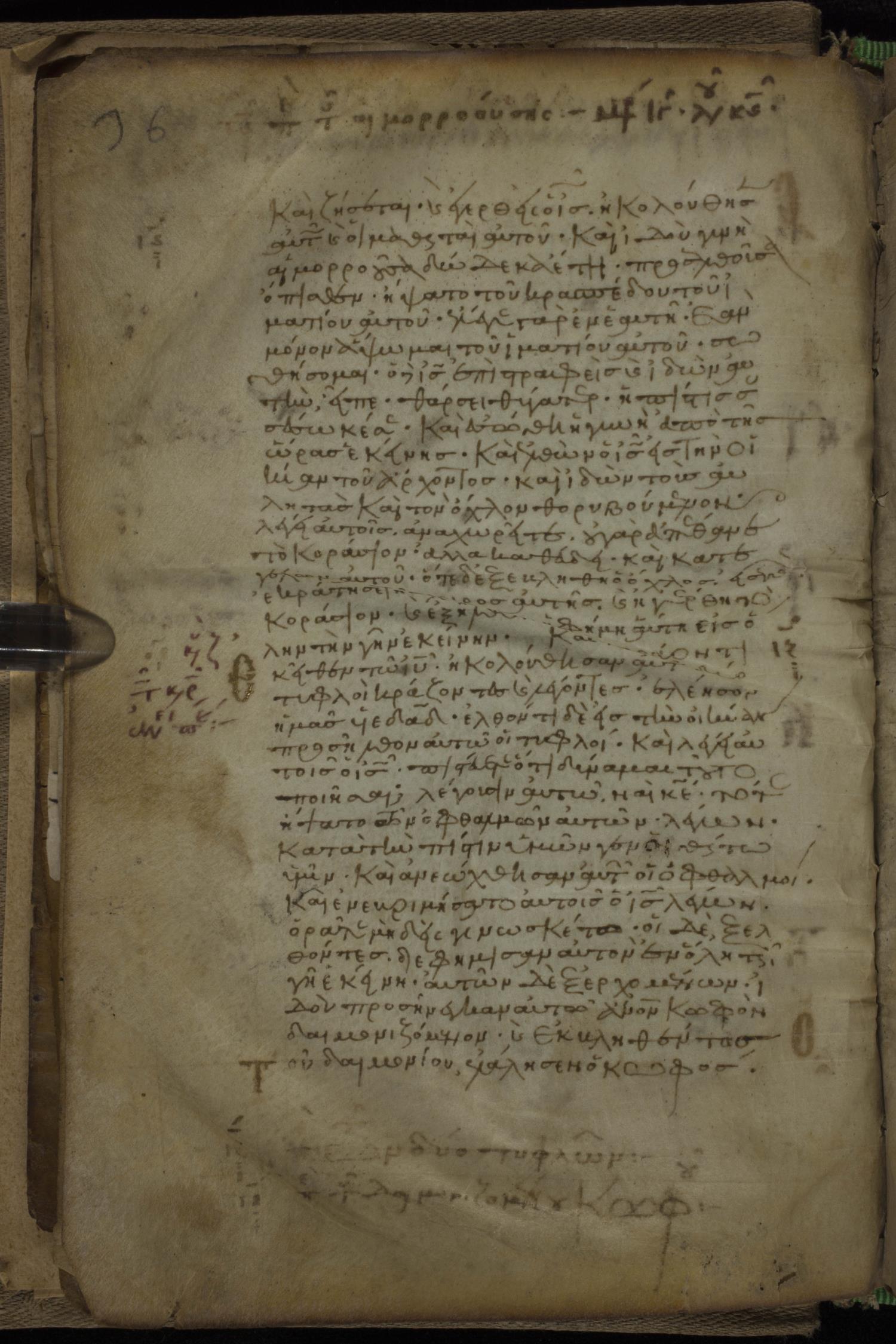 Eleventh century minuscule of the Gospels, the Apostolos, and Paul on parchment; 318 leaves, 1 column, 34 lines per column. Images were taken at the National Library of Greece in Athens.