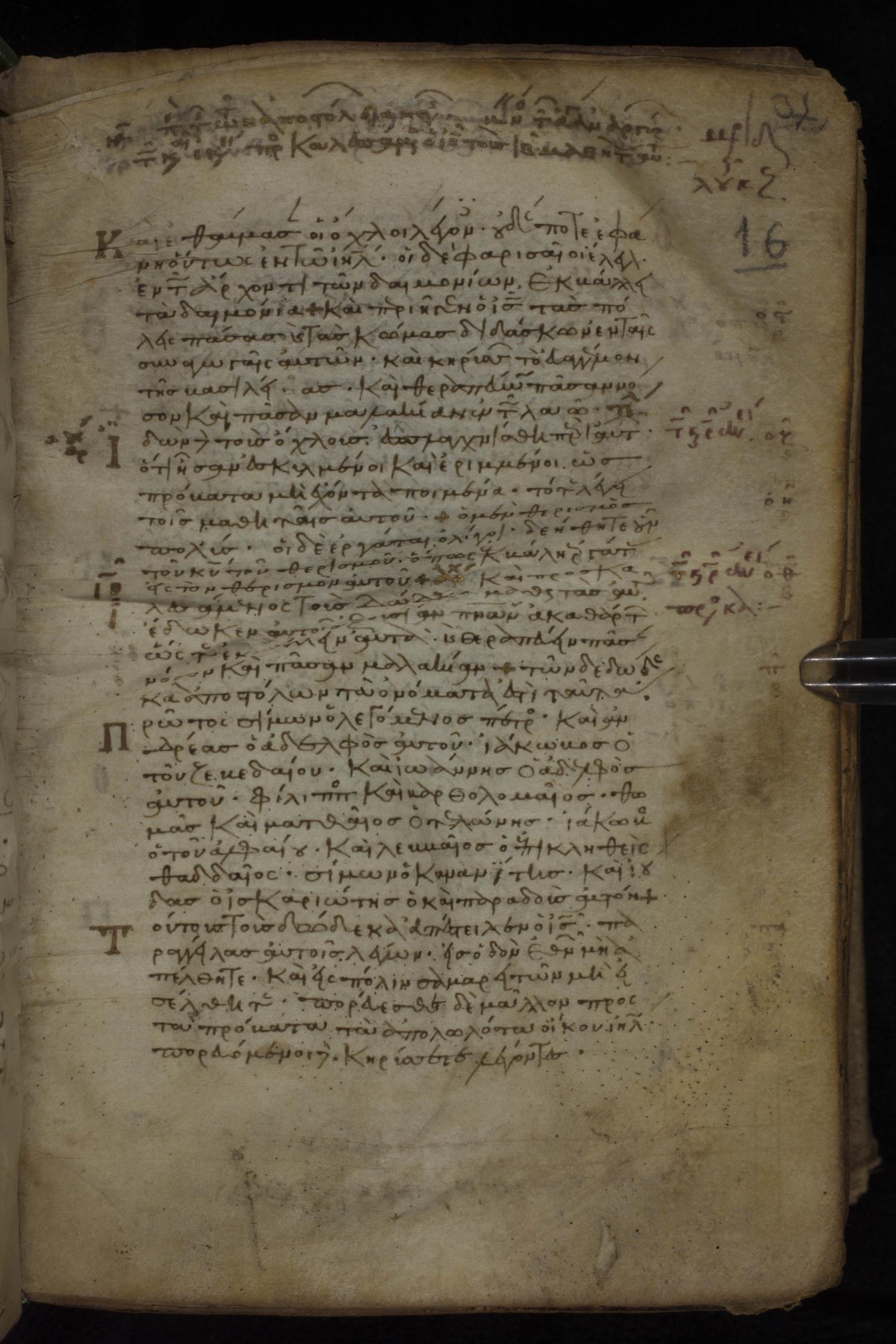 Eleventh century minuscule of the Gospels, the Apostolos, and Paul on parchment; 318 leaves, 1 column, 34 lines per column. Images were taken at the National Library of Greece in Athens.