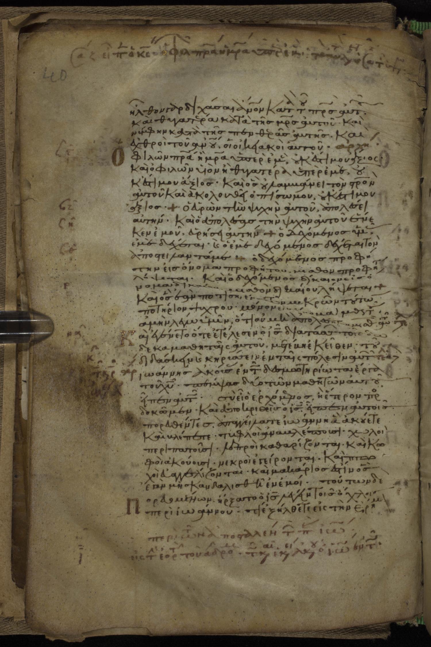 Eleventh century minuscule of the Gospels, the Apostolos, and Paul on parchment; 318 leaves, 1 column, 34 lines per column. Images were taken at the National Library of Greece in Athens.