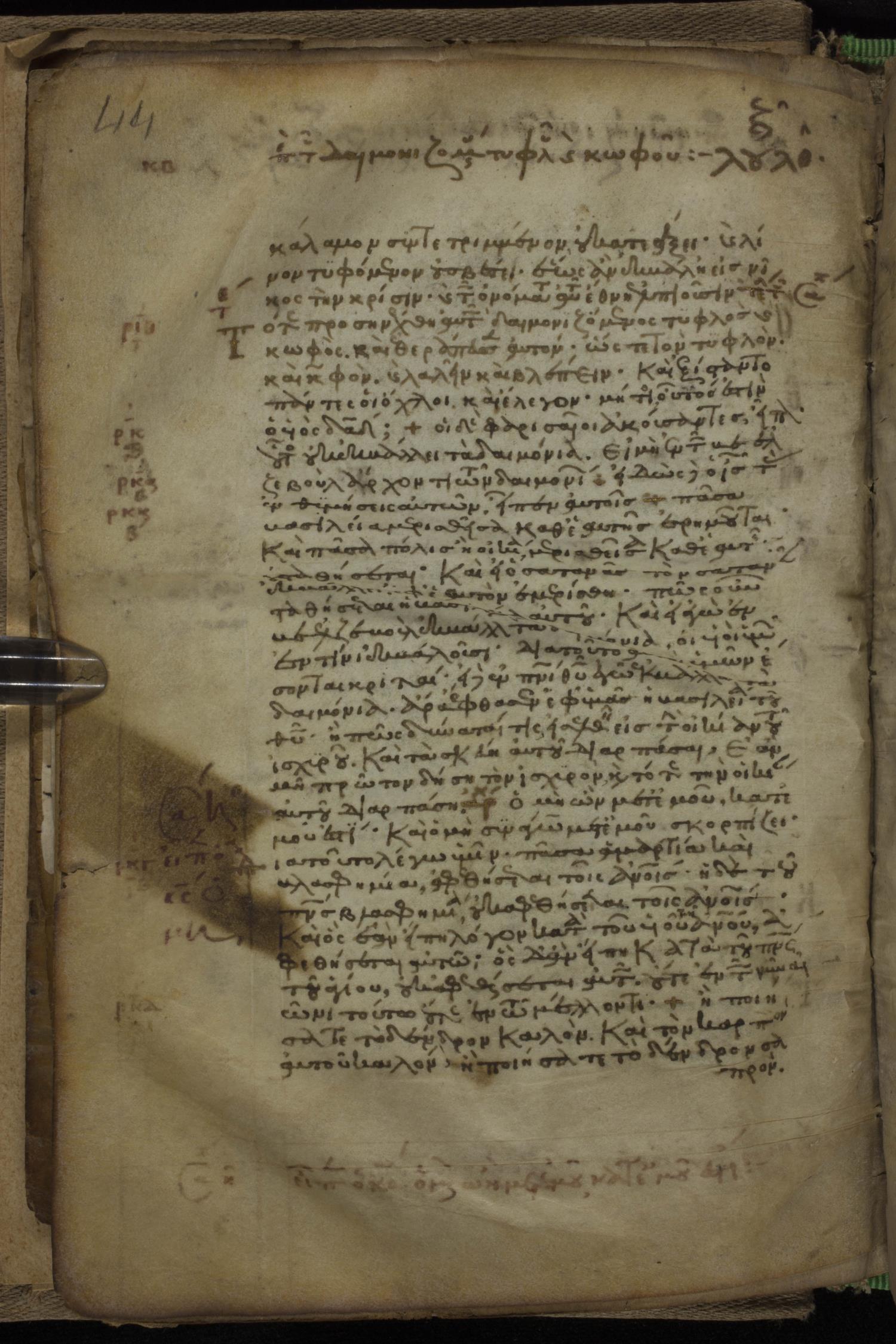 Eleventh century minuscule of the Gospels, the Apostolos, and Paul on parchment; 318 leaves, 1 column, 34 lines per column. Images were taken at the National Library of Greece in Athens.