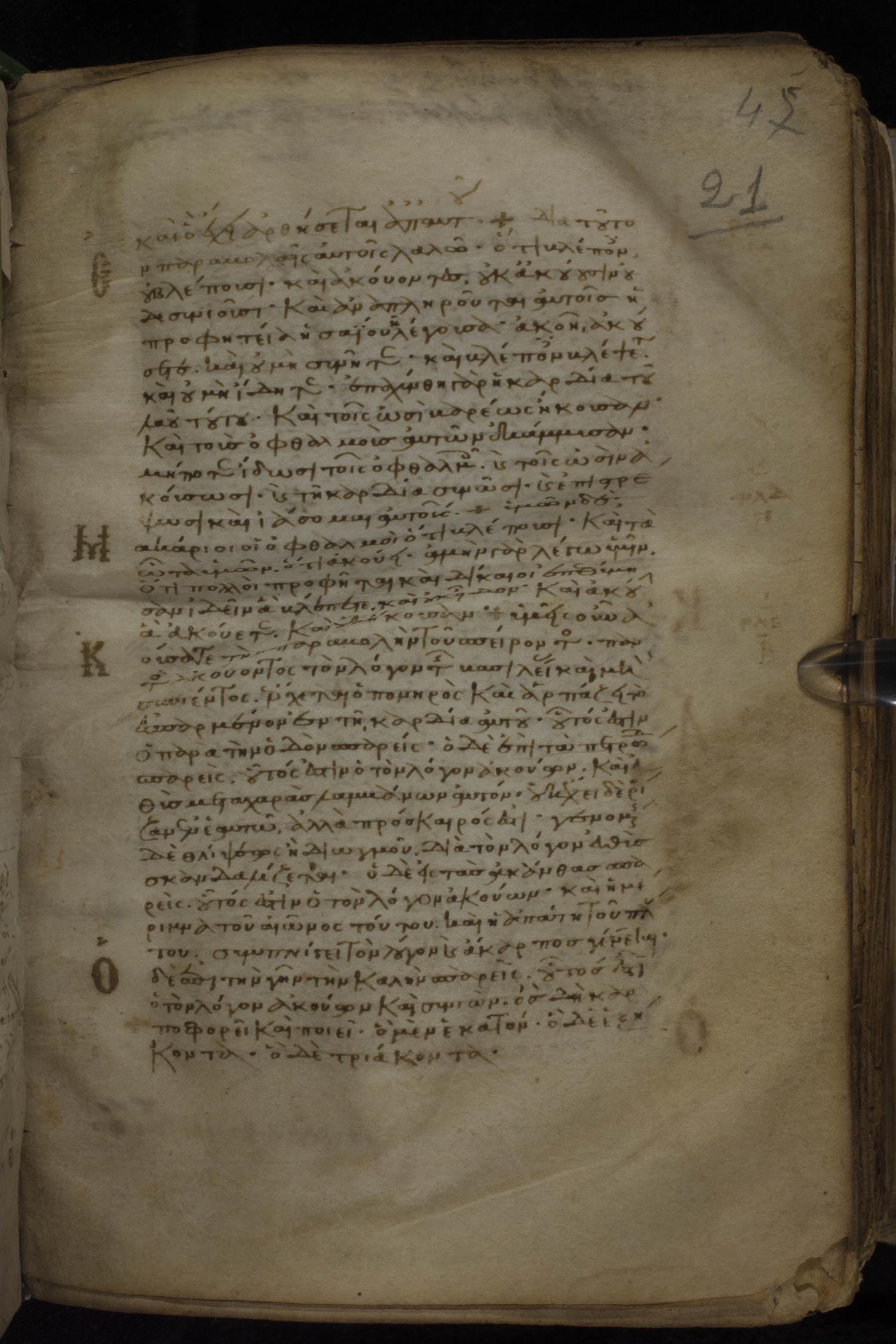 Eleventh century minuscule of the Gospels, the Apostolos, and Paul on parchment; 318 leaves, 1 column, 34 lines per column. Images were taken at the National Library of Greece in Athens.