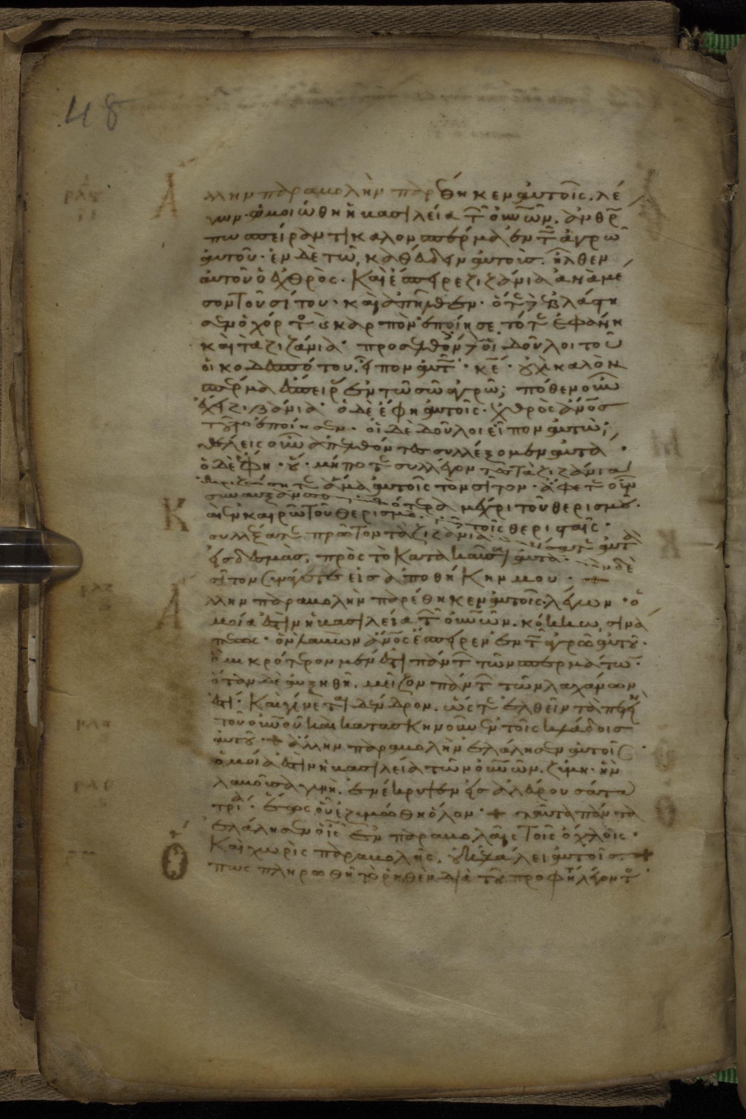 Eleventh century minuscule of the Gospels, the Apostolos, and Paul on parchment; 318 leaves, 1 column, 34 lines per column. Images were taken at the National Library of Greece in Athens.