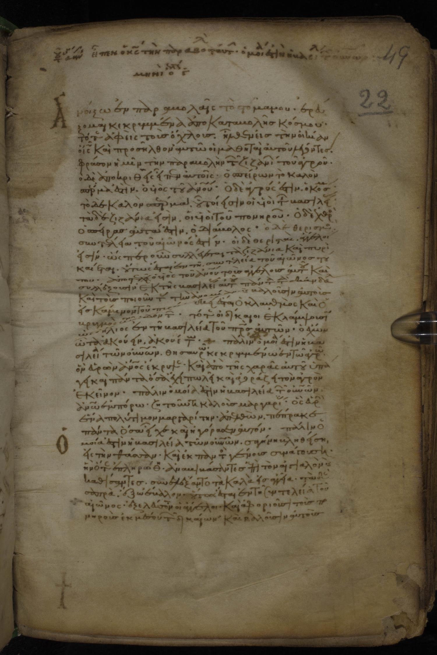 Eleventh century minuscule of the Gospels, the Apostolos, and Paul on parchment; 318 leaves, 1 column, 34 lines per column. Images were taken at the National Library of Greece in Athens.