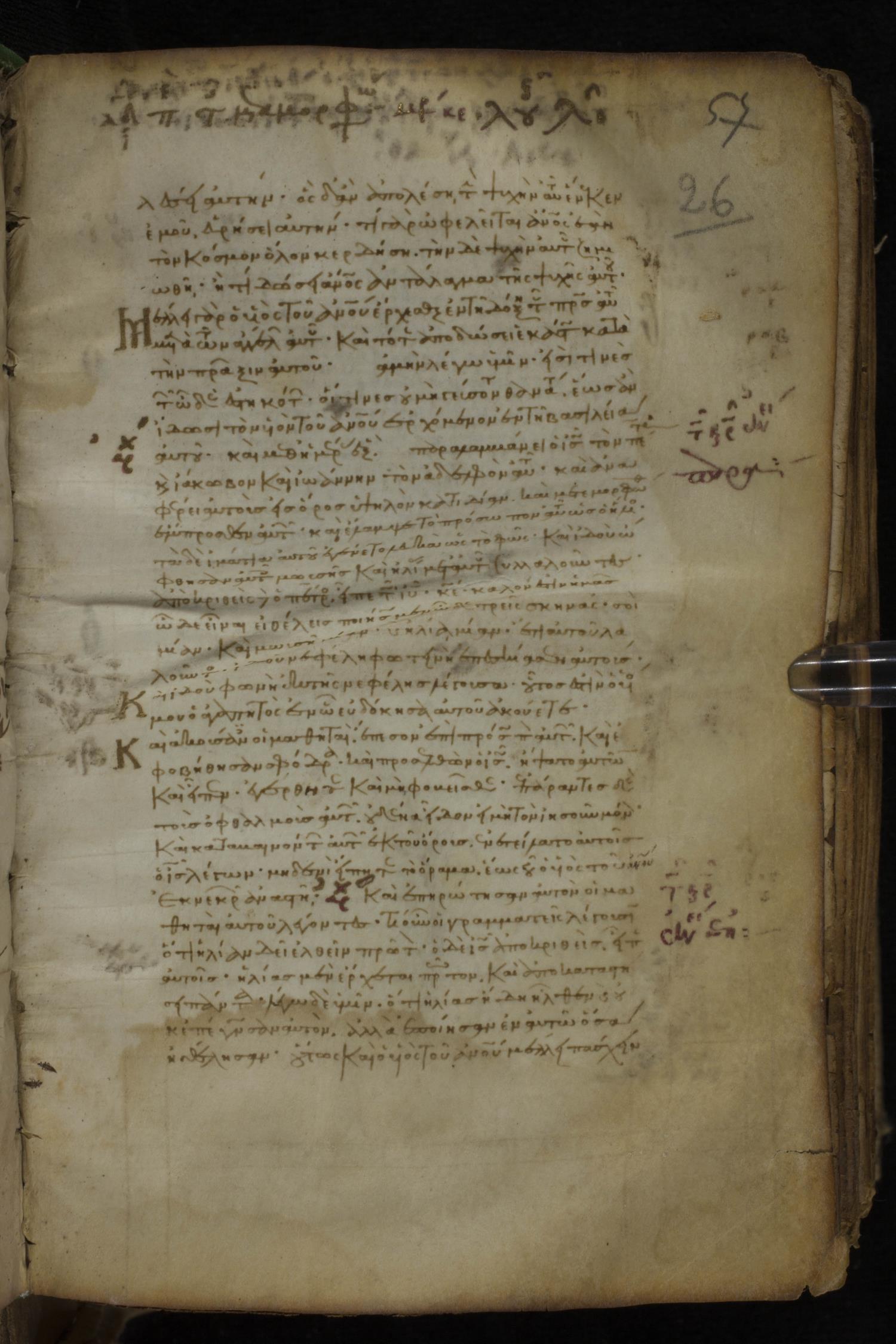 Eleventh century minuscule of the Gospels, the Apostolos, and Paul on parchment; 318 leaves, 1 column, 34 lines per column. Images were taken at the National Library of Greece in Athens.