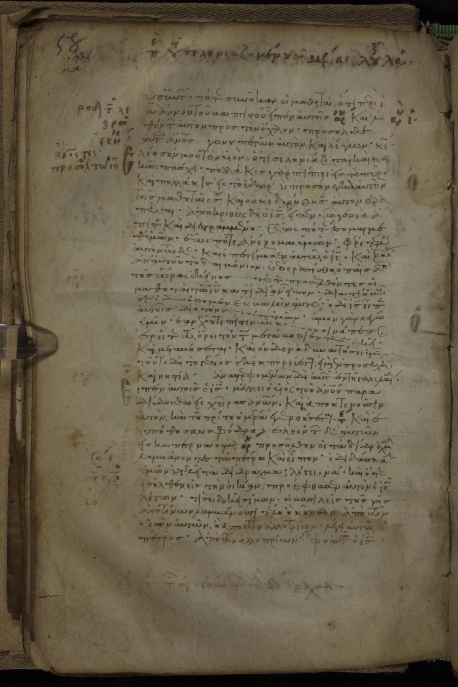 Eleventh century minuscule of the Gospels, the Apostolos, and Paul on parchment; 318 leaves, 1 column, 34 lines per column. Images were taken at the National Library of Greece in Athens.