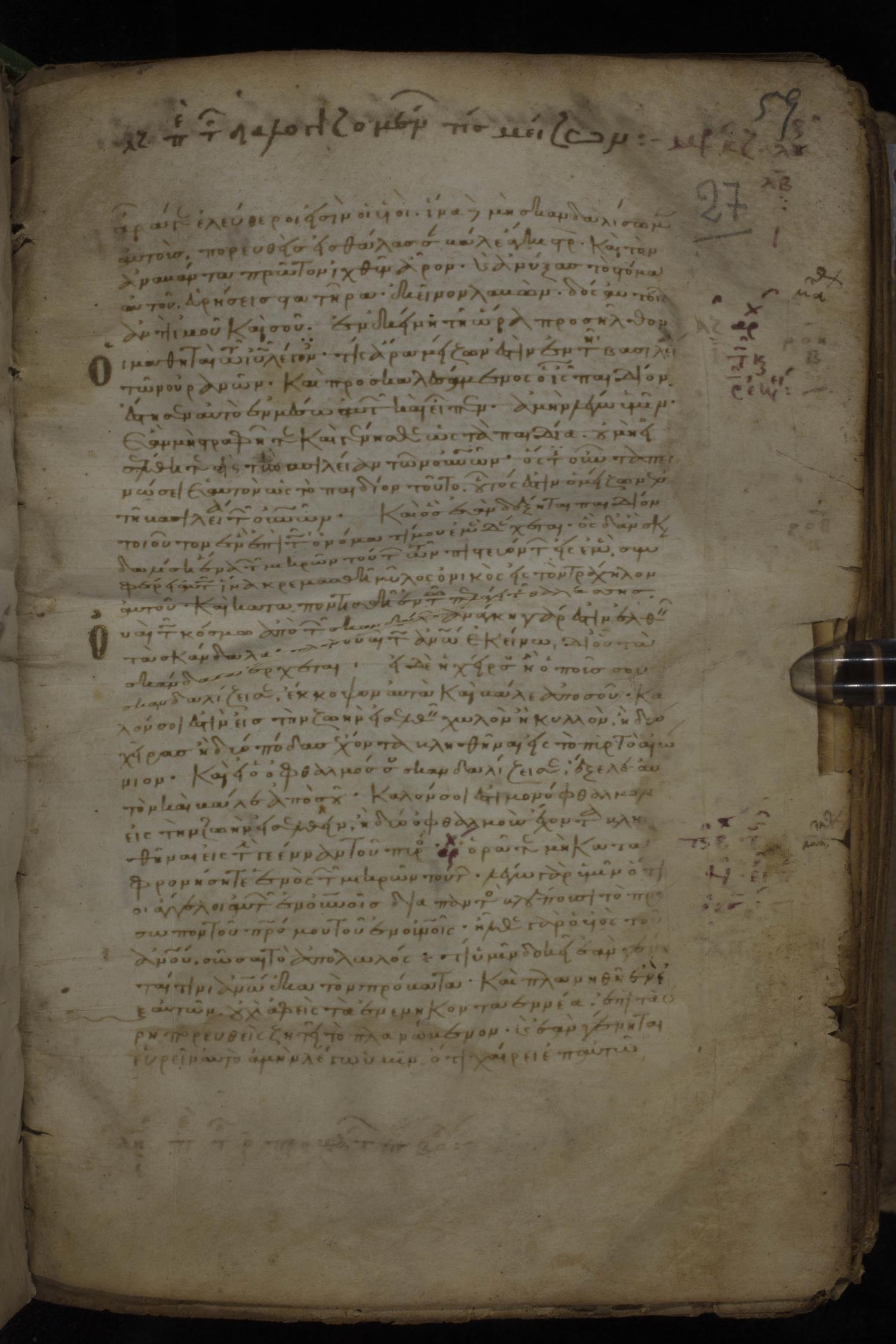 Eleventh century minuscule of the Gospels, the Apostolos, and Paul on parchment; 318 leaves, 1 column, 34 lines per column. Images were taken at the National Library of Greece in Athens.