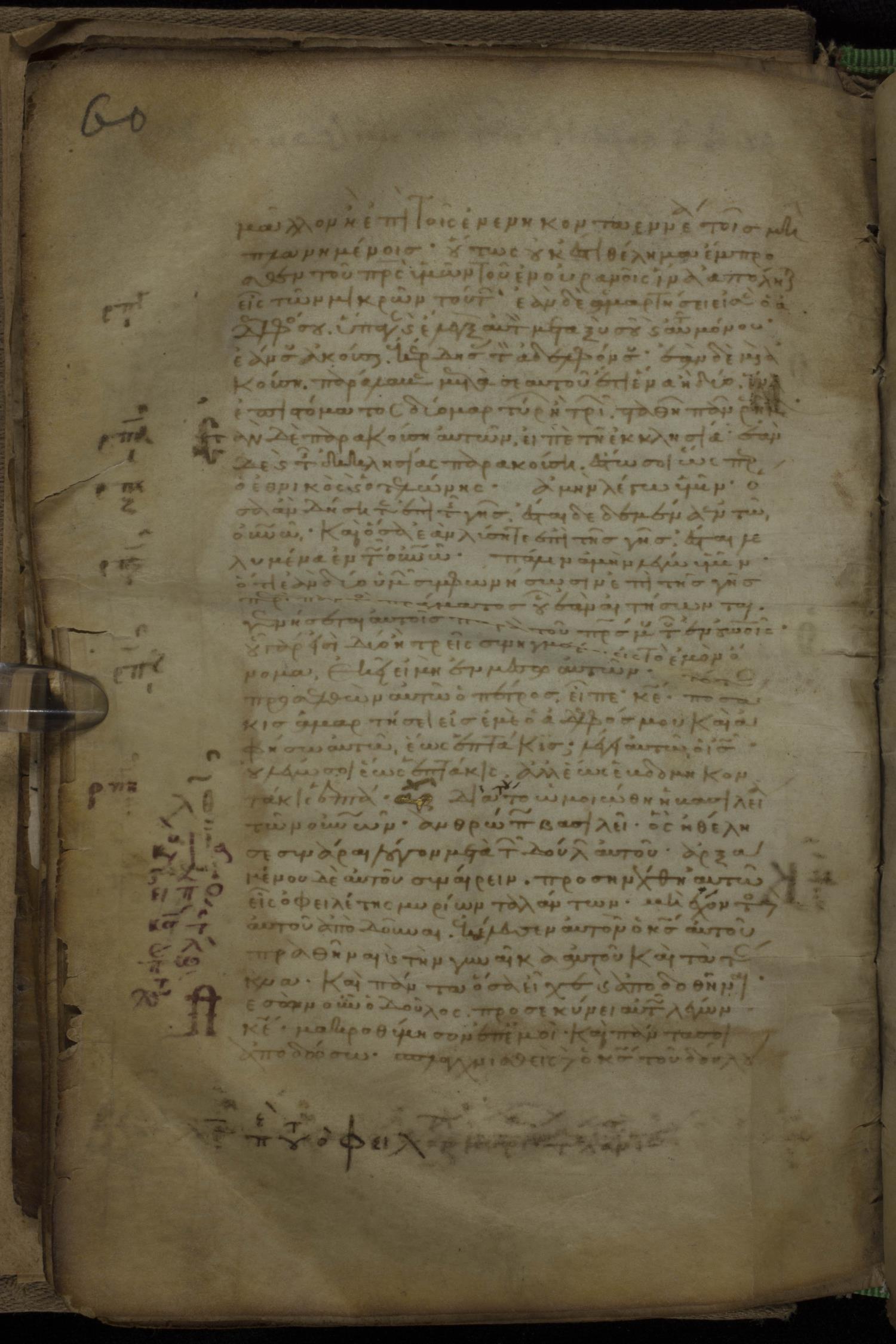 Eleventh century minuscule of the Gospels, the Apostolos, and Paul on parchment; 318 leaves, 1 column, 34 lines per column. Images were taken at the National Library of Greece in Athens.