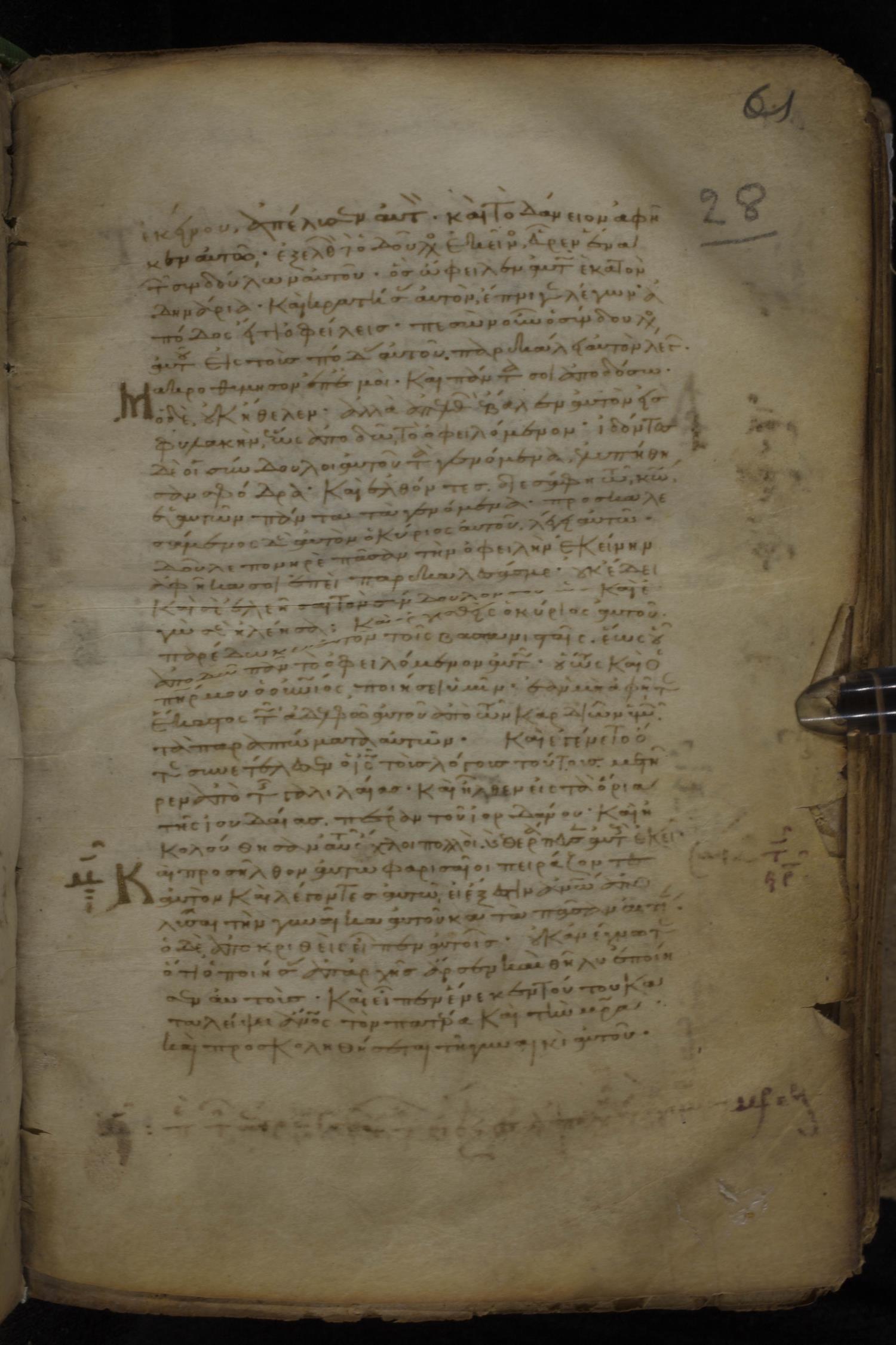 Eleventh century minuscule of the Gospels, the Apostolos, and Paul on parchment; 318 leaves, 1 column, 34 lines per column. Images were taken at the National Library of Greece in Athens.