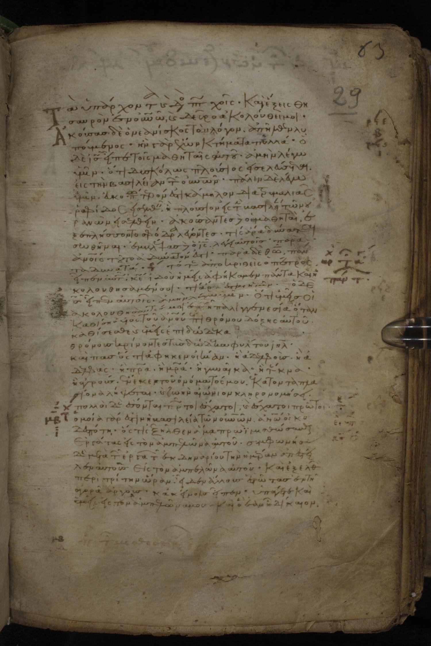 Eleventh century minuscule of the Gospels, the Apostolos, and Paul on parchment; 318 leaves, 1 column, 34 lines per column. Images were taken at the National Library of Greece in Athens.
