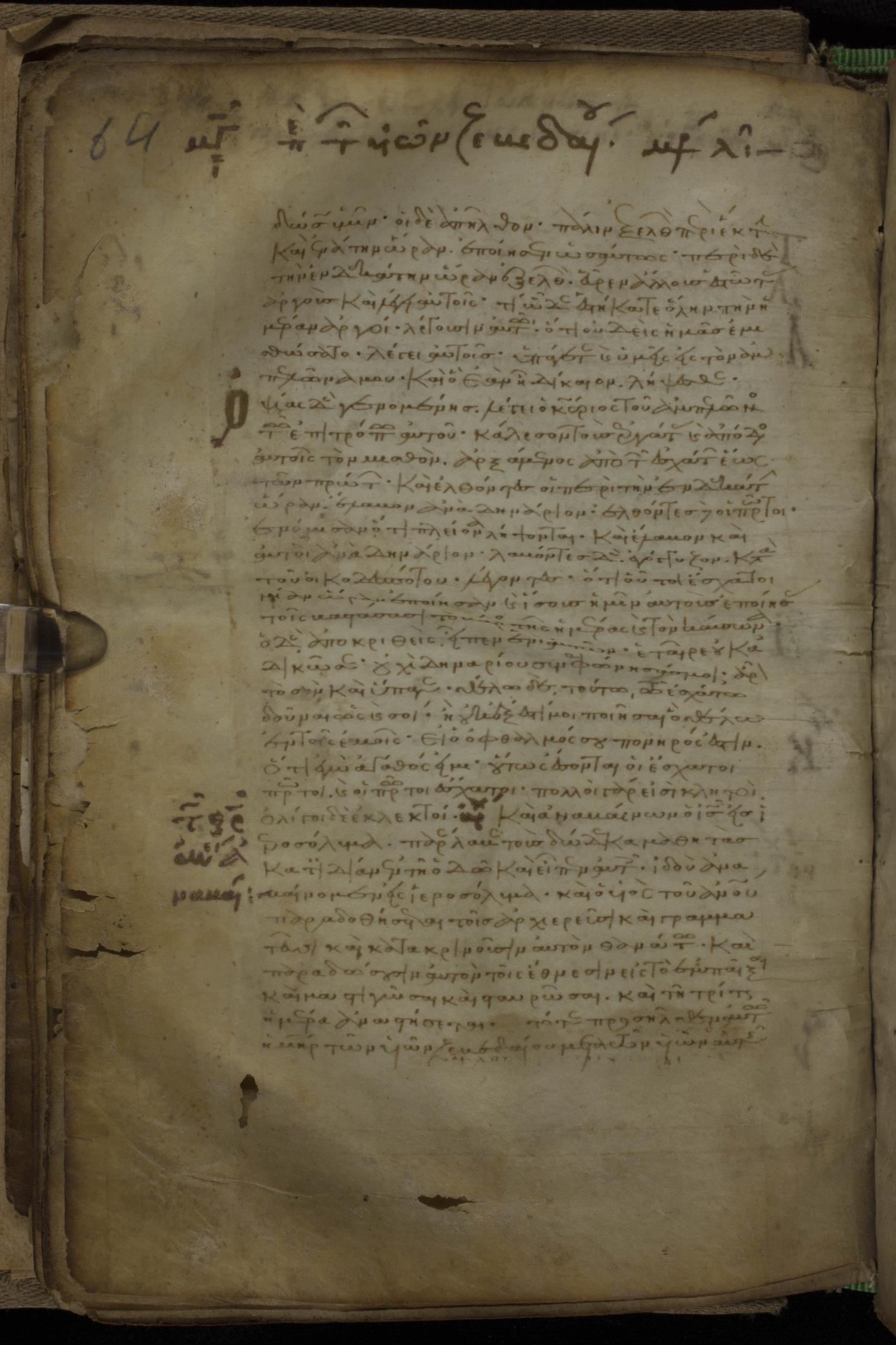 Eleventh century minuscule of the Gospels, the Apostolos, and Paul on parchment; 318 leaves, 1 column, 34 lines per column. Images were taken at the National Library of Greece in Athens.