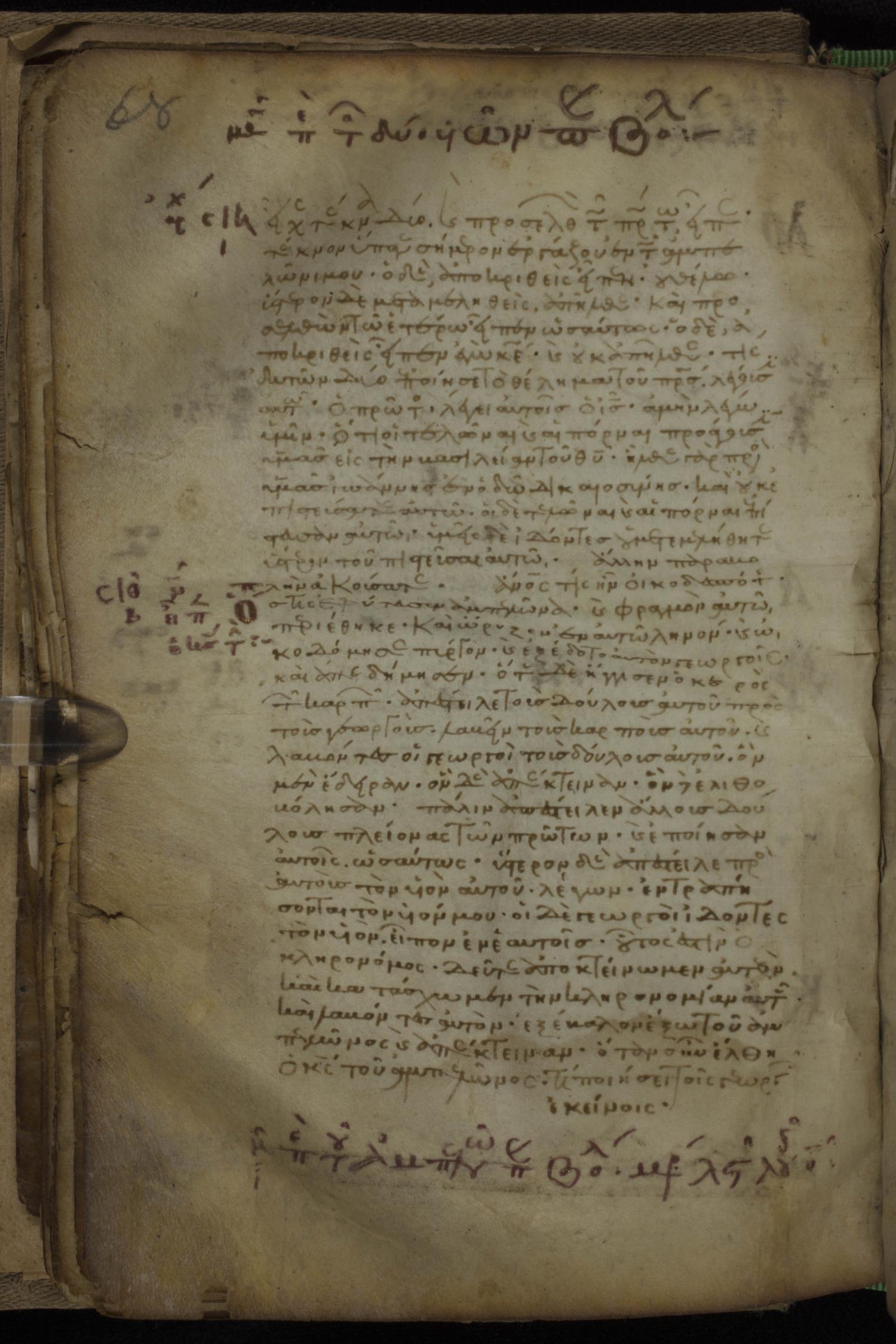 Eleventh century minuscule of the Gospels, the Apostolos, and Paul on parchment; 318 leaves, 1 column, 34 lines per column. Images were taken at the National Library of Greece in Athens.