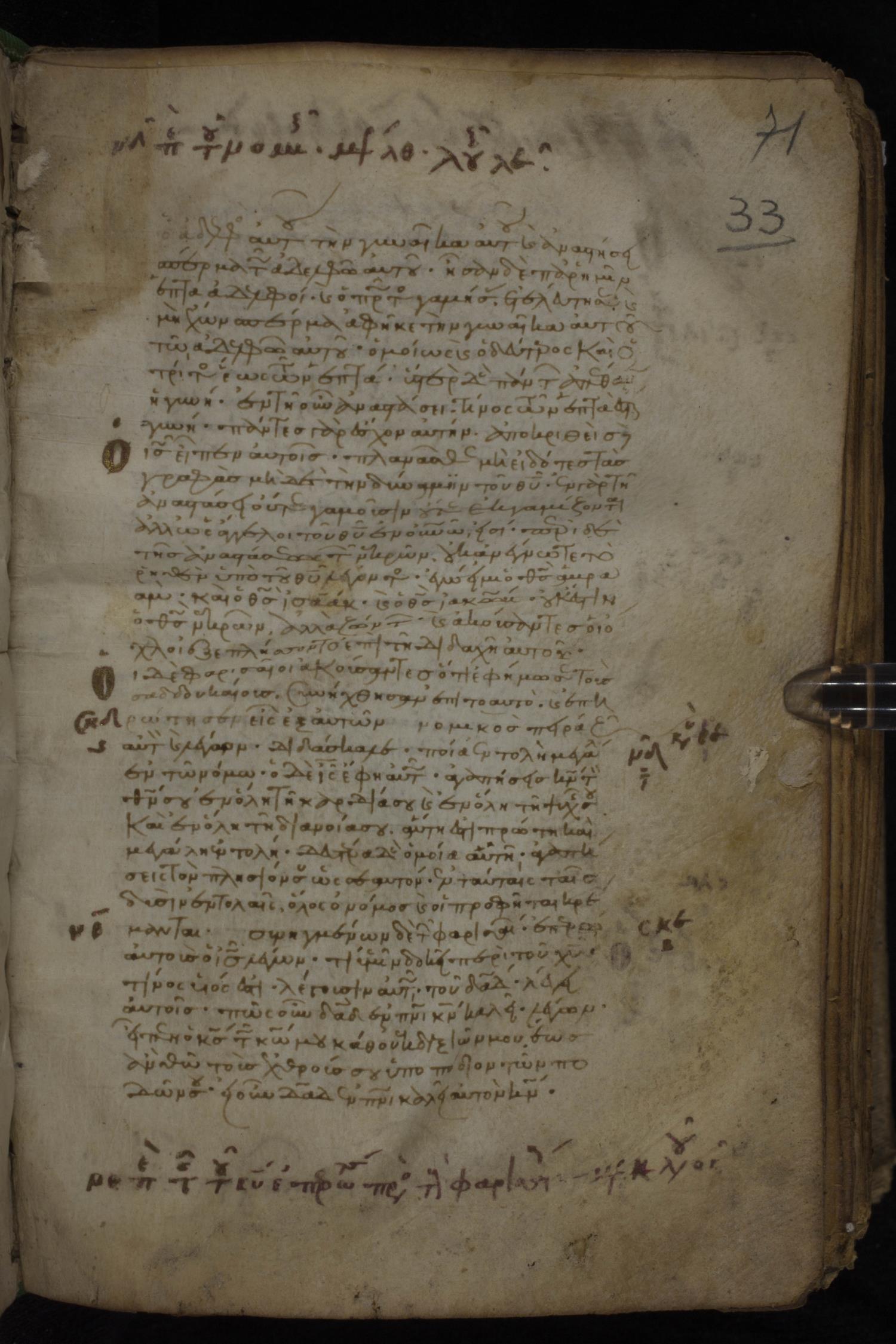Eleventh century minuscule of the Gospels, the Apostolos, and Paul on parchment; 318 leaves, 1 column, 34 lines per column. Images were taken at the National Library of Greece in Athens.
