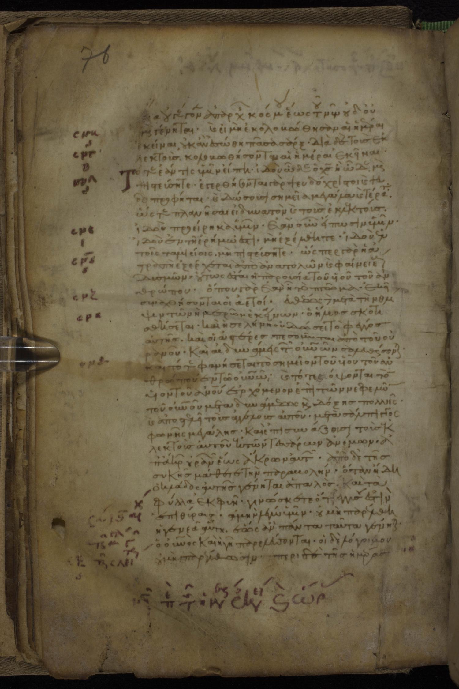 Eleventh century minuscule of the Gospels, the Apostolos, and Paul on parchment; 318 leaves, 1 column, 34 lines per column. Images were taken at the National Library of Greece in Athens.
