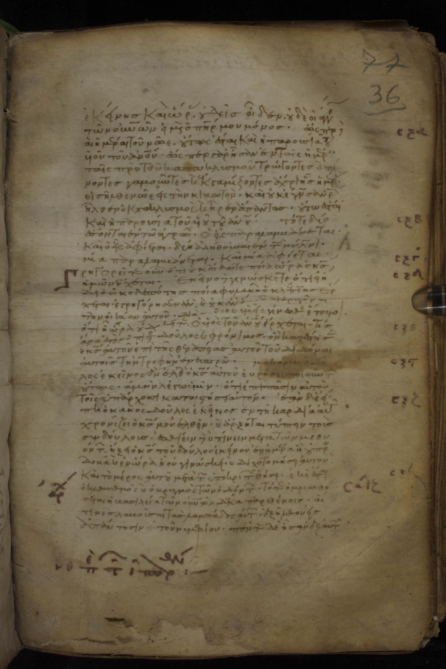 Eleventh century minuscule of the Gospels, the Apostolos, and Paul on parchment; 318 leaves, 1 column, 34 lines per column. Images were taken at the National Library of Greece in Athens.
