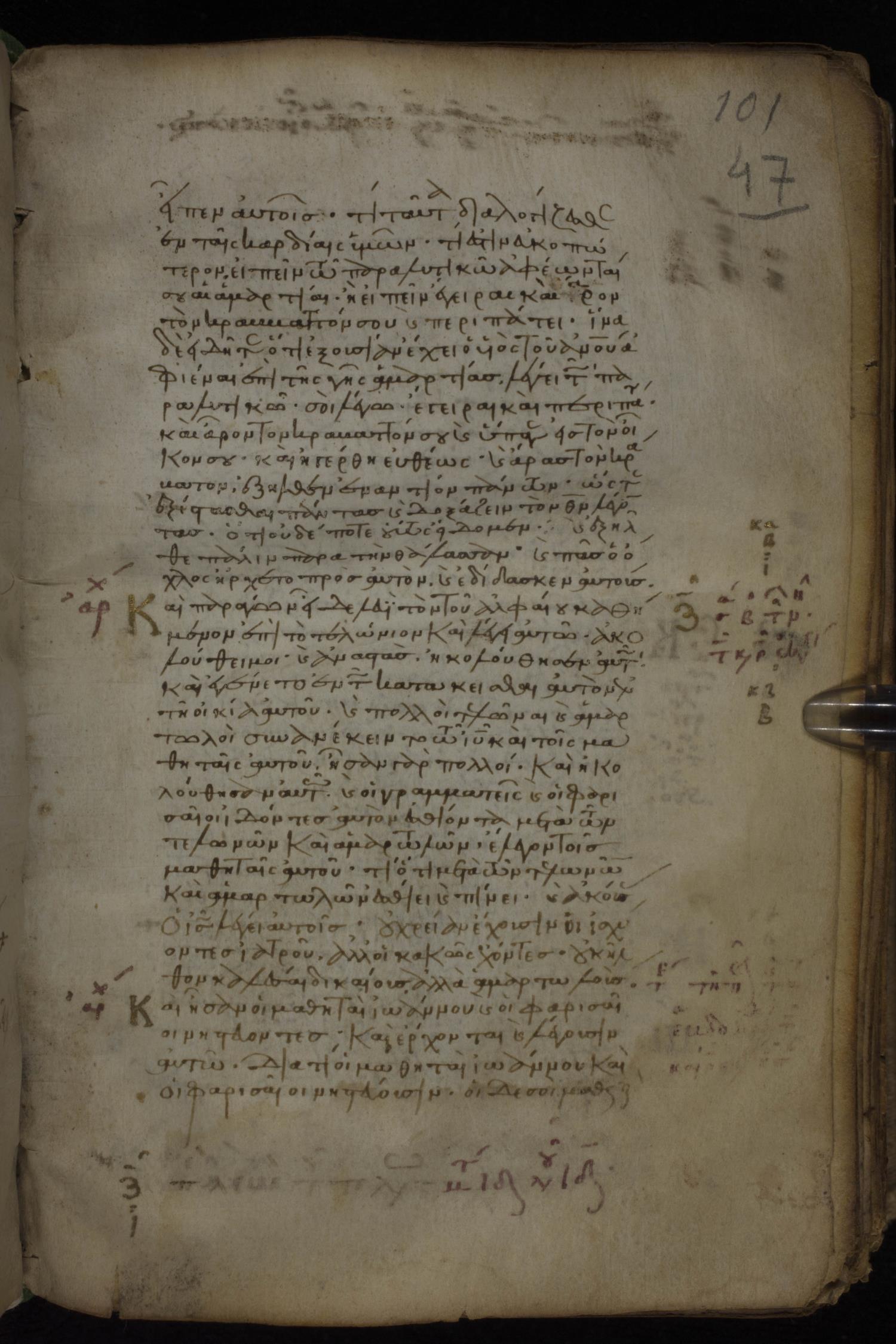 Eleventh century minuscule of the Gospels, the Apostolos, and Paul on parchment; 318 leaves, 1 column, 34 lines per column. Images were taken at the National Library of Greece in Athens.