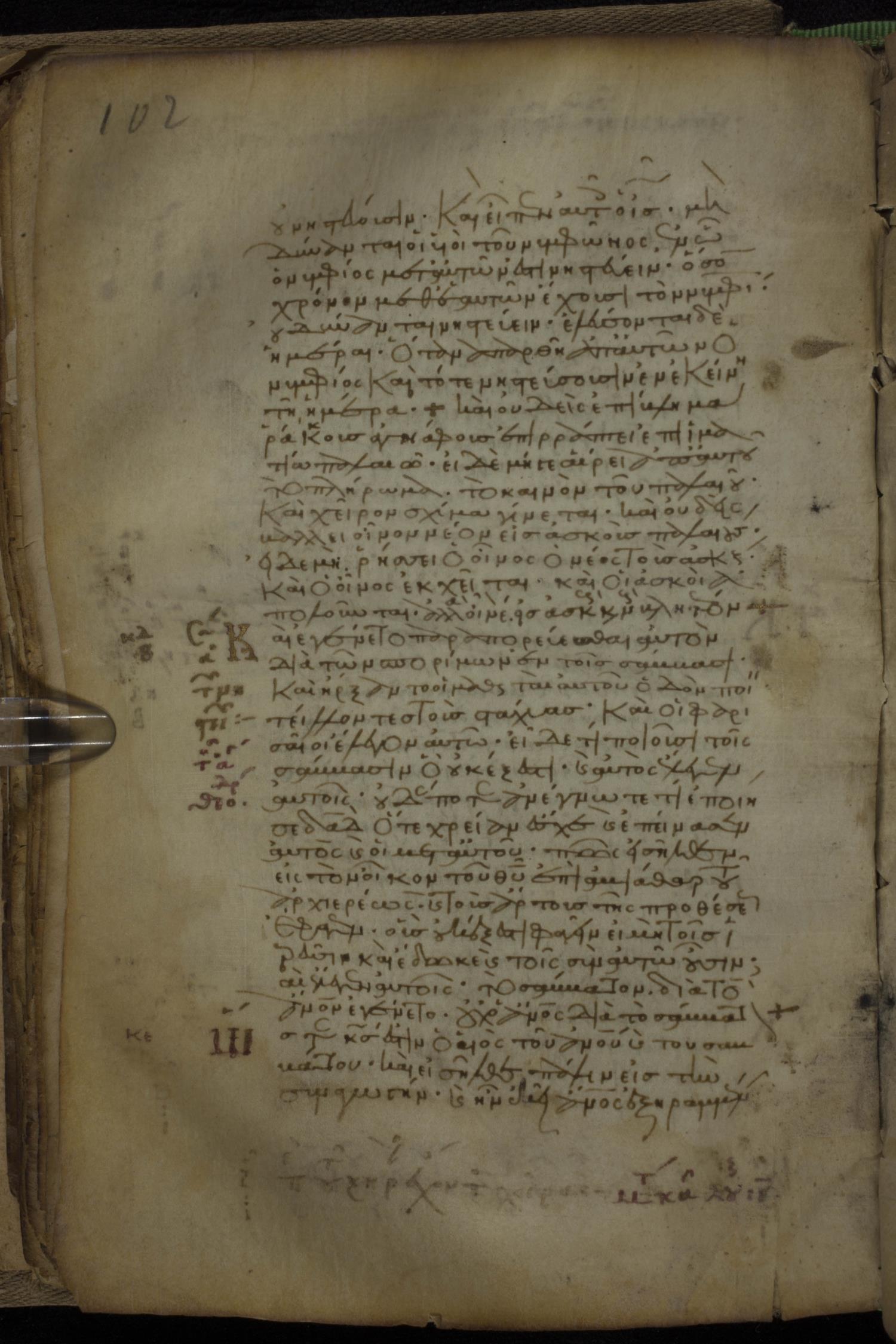 Eleventh century minuscule of the Gospels, the Apostolos, and Paul on parchment; 318 leaves, 1 column, 34 lines per column. Images were taken at the National Library of Greece in Athens.