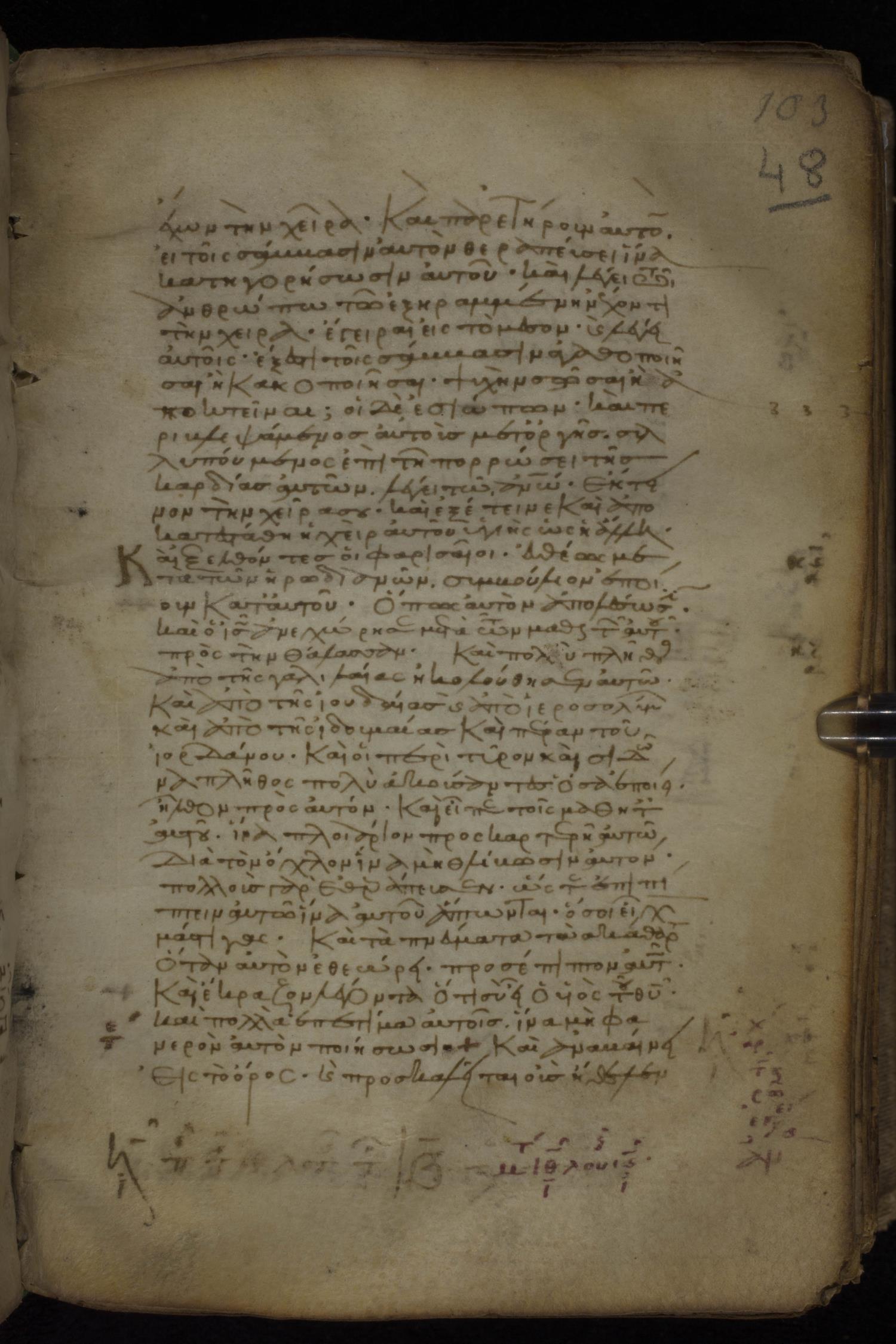Eleventh century minuscule of the Gospels, the Apostolos, and Paul on parchment; 318 leaves, 1 column, 34 lines per column. Images were taken at the National Library of Greece in Athens.