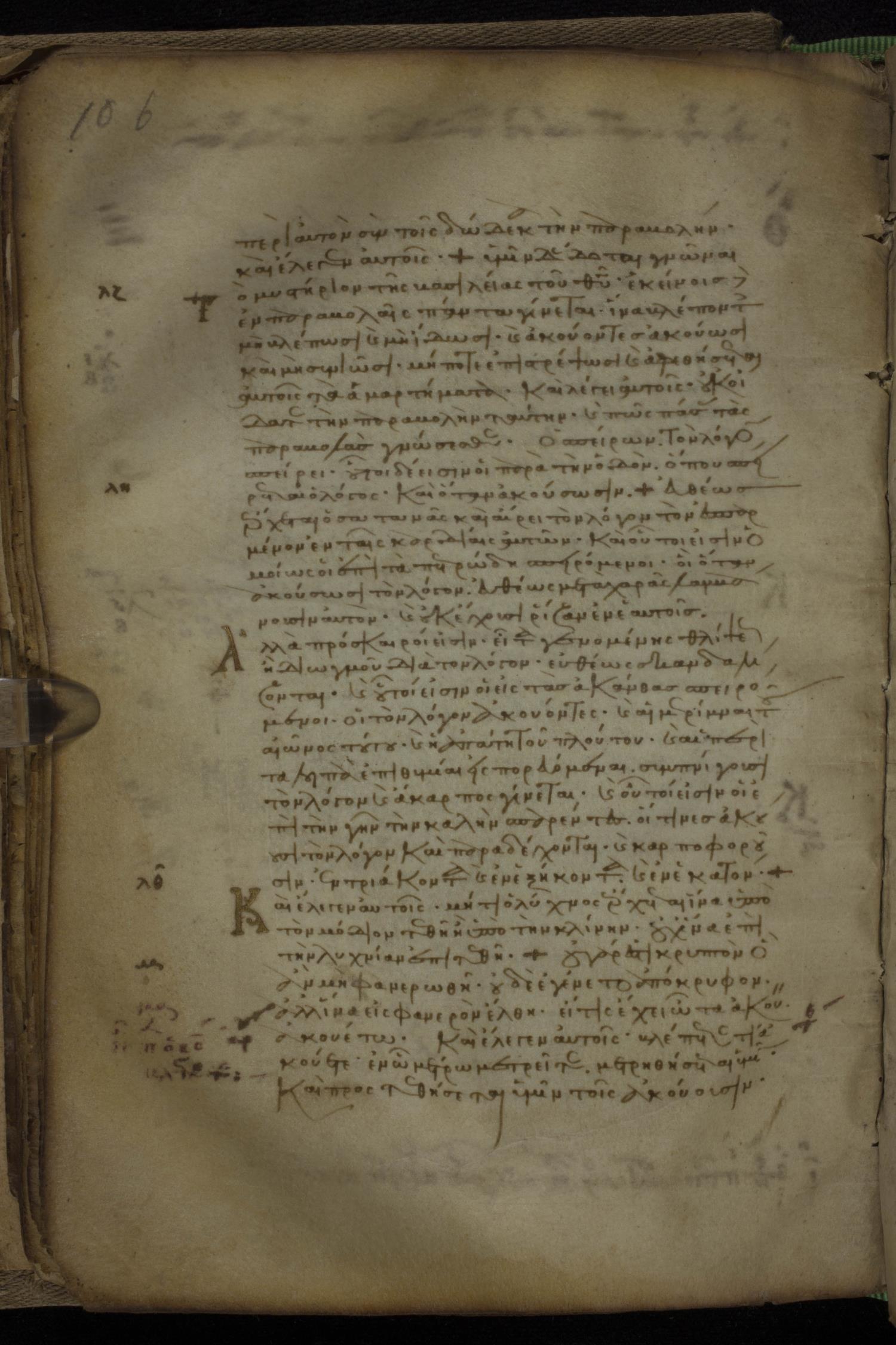 Eleventh century minuscule of the Gospels, the Apostolos, and Paul on parchment; 318 leaves, 1 column, 34 lines per column. Images were taken at the National Library of Greece in Athens.