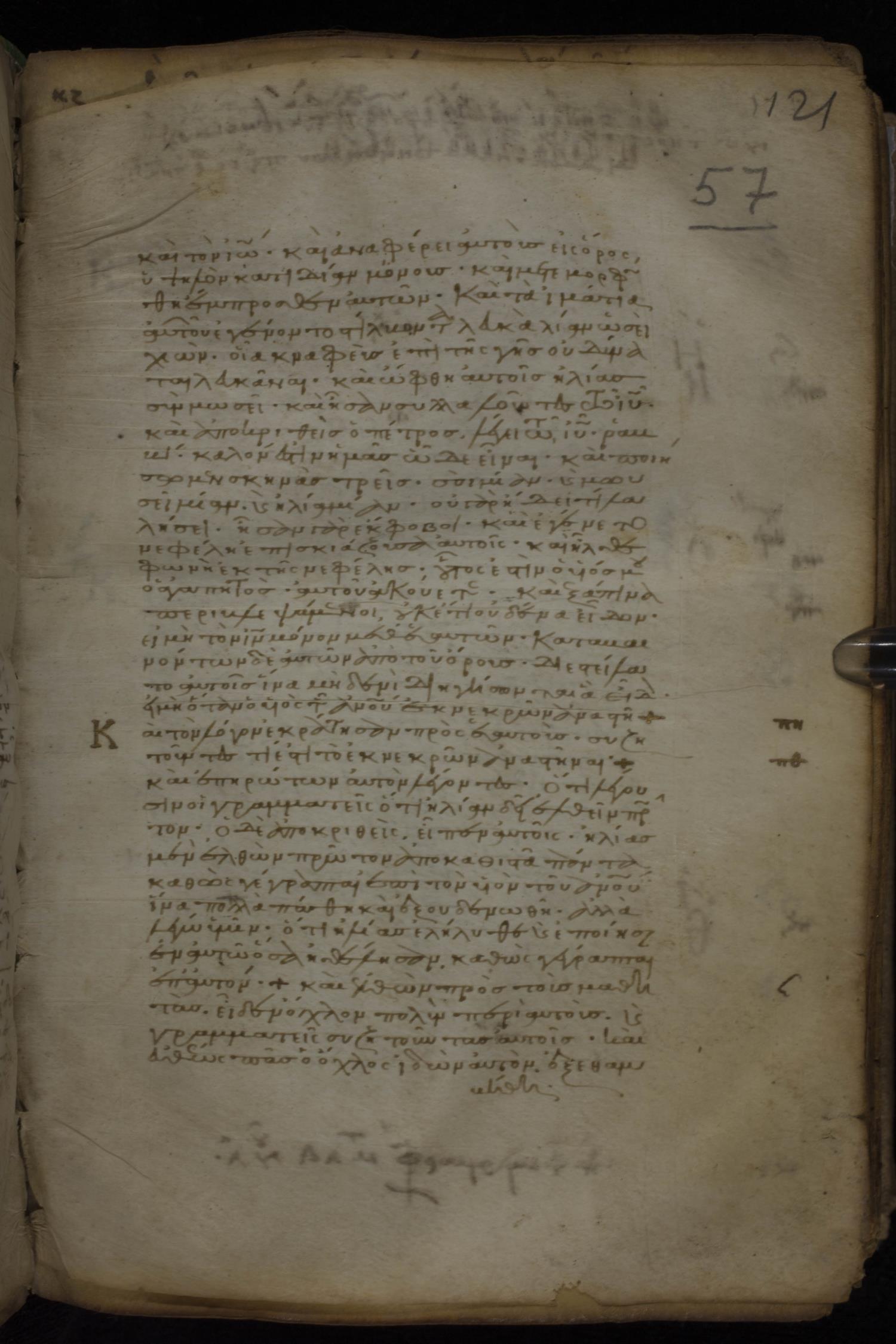 Eleventh century minuscule of the Gospels, the Apostolos, and Paul on parchment; 318 leaves, 1 column, 34 lines per column. Images were taken at the National Library of Greece in Athens.