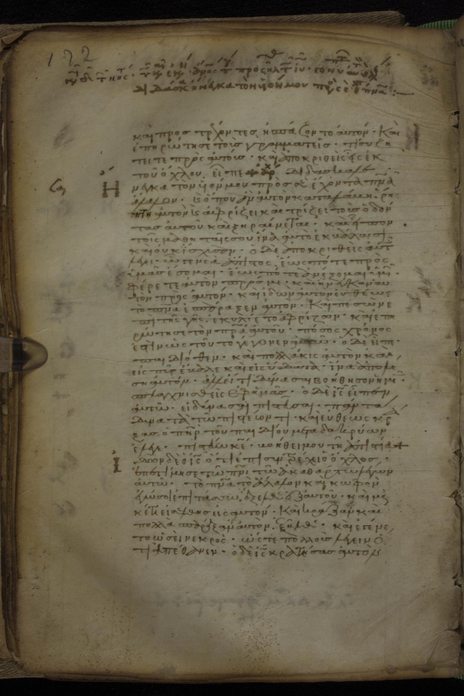 Eleventh century minuscule of the Gospels, the Apostolos, and Paul on parchment; 318 leaves, 1 column, 34 lines per column. Images were taken at the National Library of Greece in Athens.