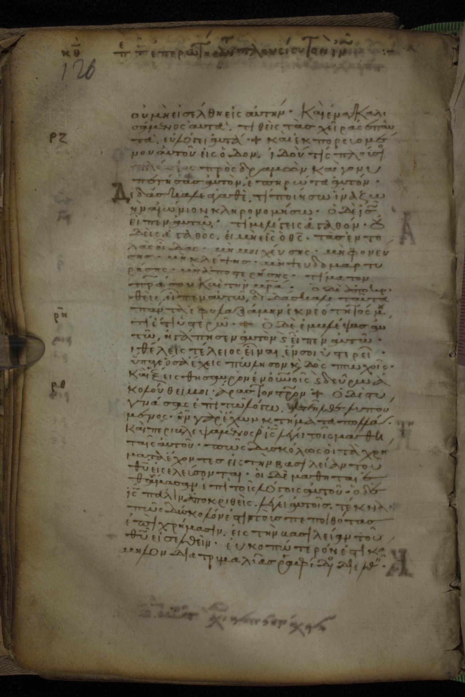 Eleventh century minuscule of the Gospels, the Apostolos, and Paul on parchment; 318 leaves, 1 column, 34 lines per column. Images were taken at the National Library of Greece in Athens.