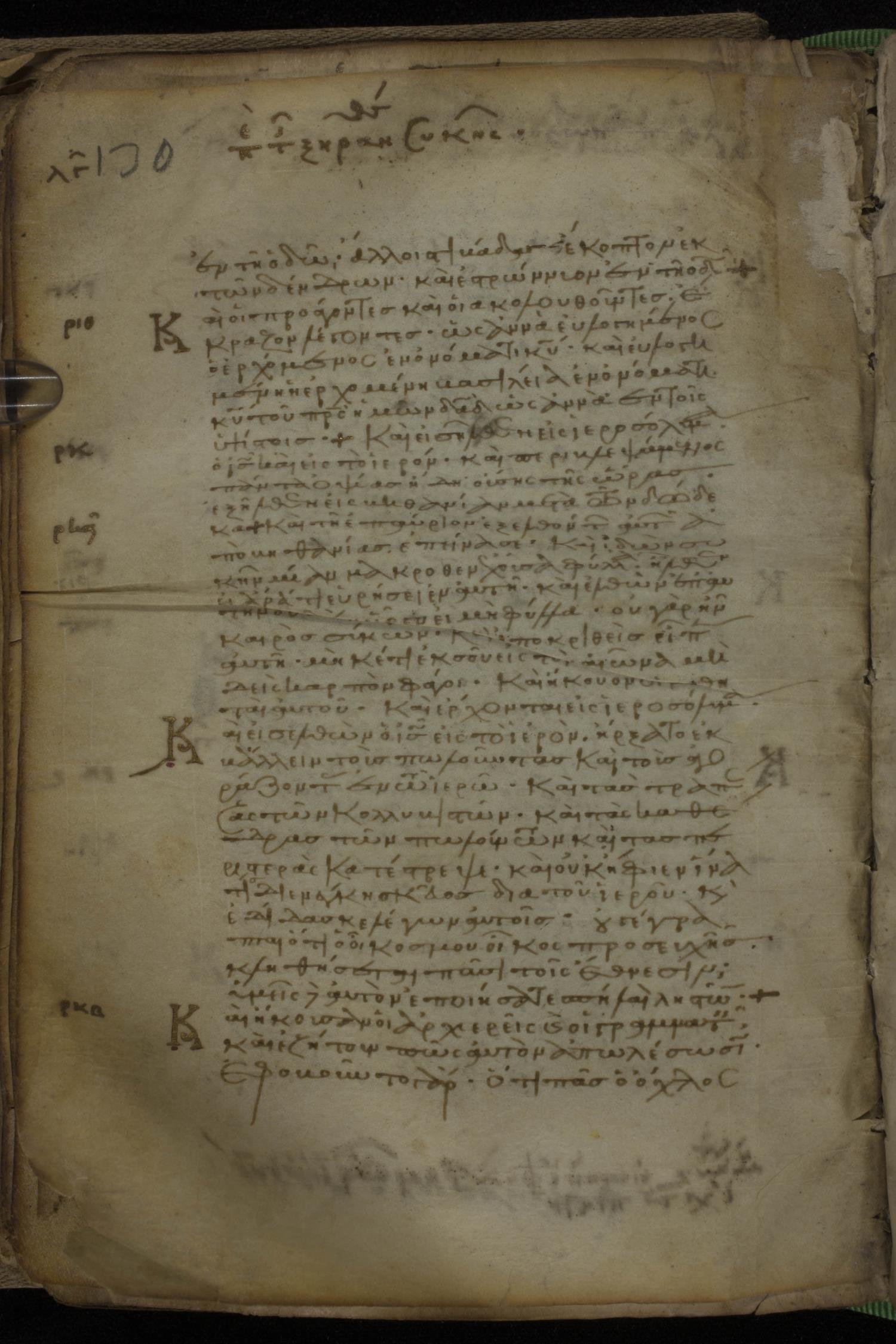 Eleventh century minuscule of the Gospels, the Apostolos, and Paul on parchment; 318 leaves, 1 column, 34 lines per column. Images were taken at the National Library of Greece in Athens.