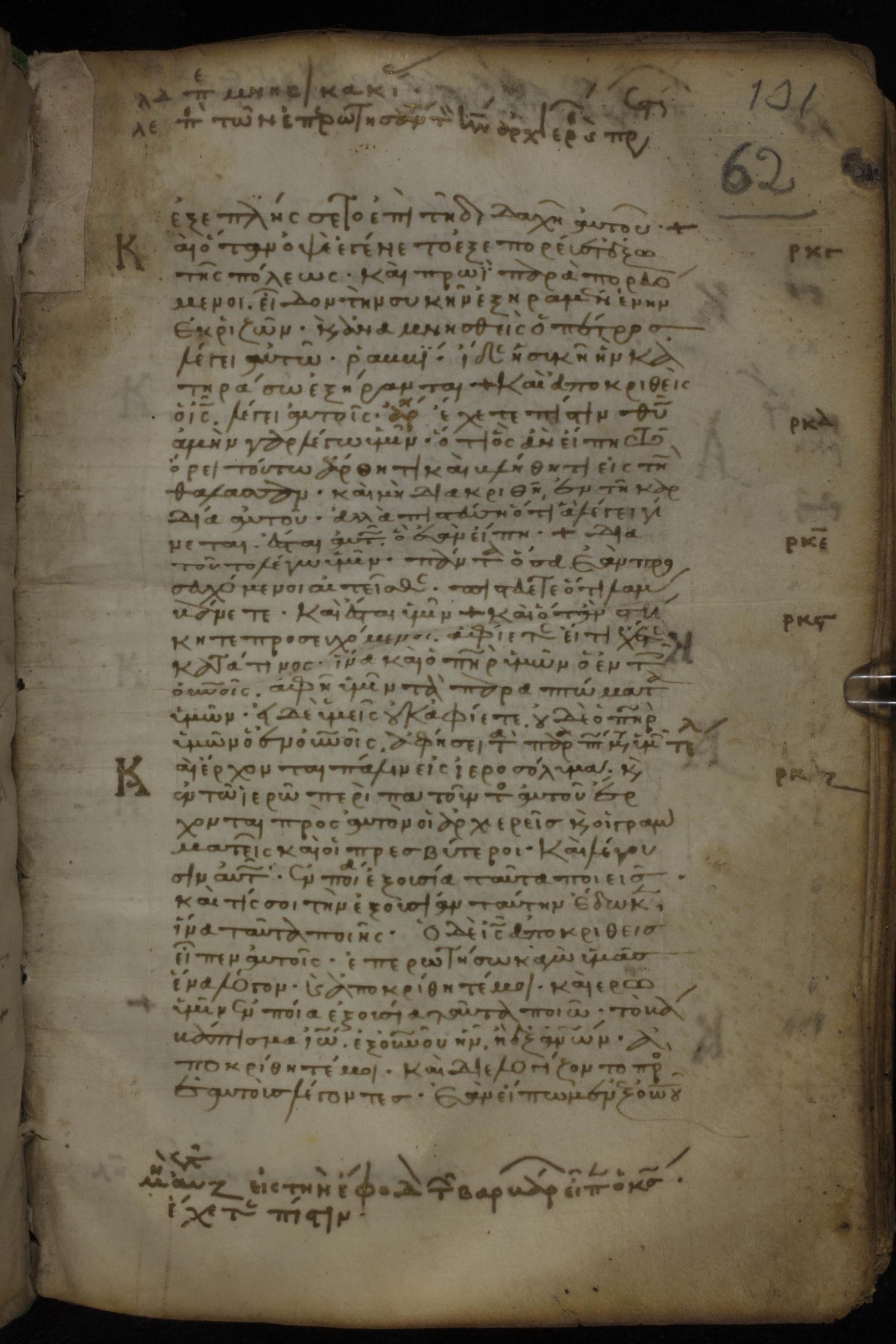 Eleventh century minuscule of the Gospels, the Apostolos, and Paul on parchment; 318 leaves, 1 column, 34 lines per column. Images were taken at the National Library of Greece in Athens.