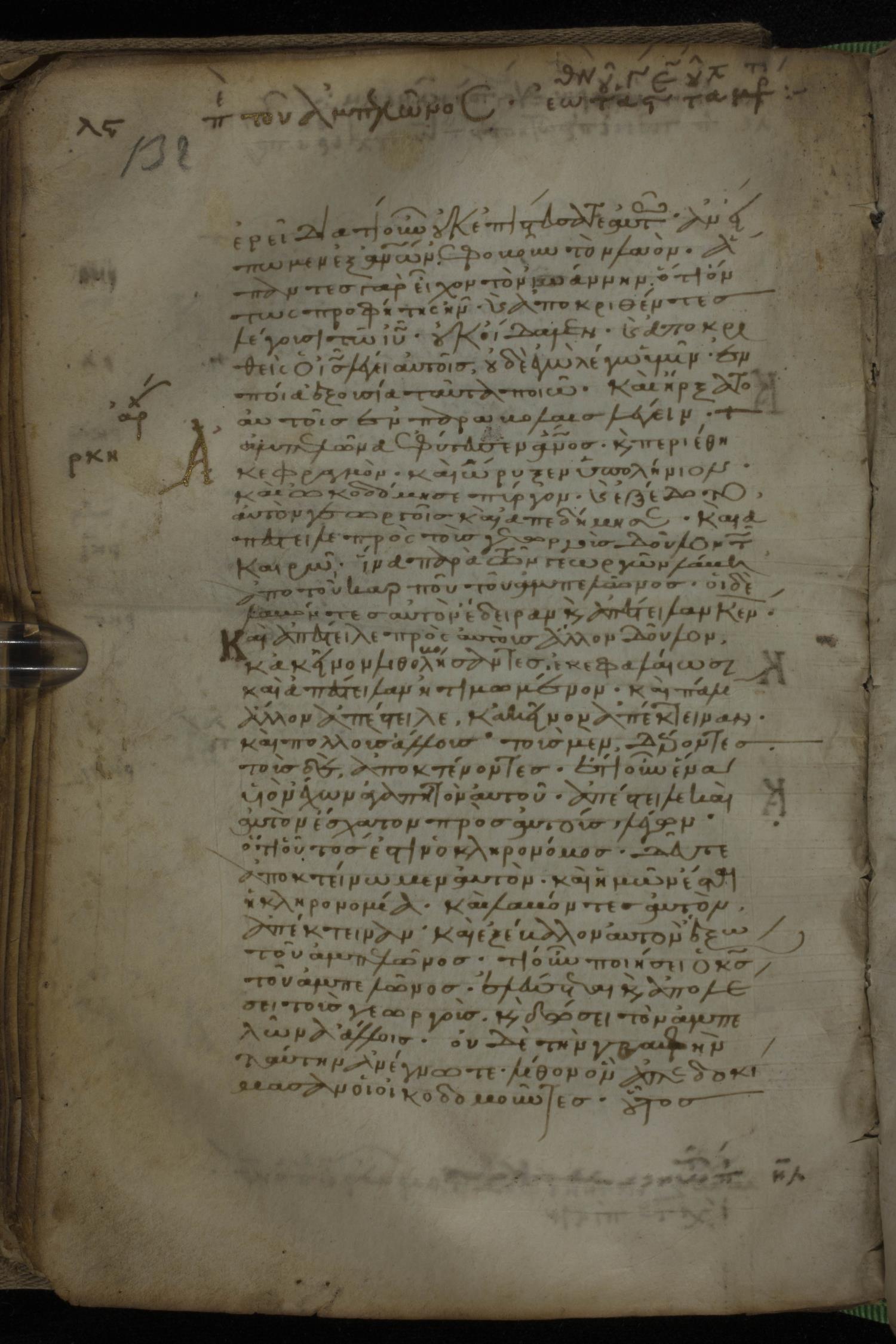 Eleventh century minuscule of the Gospels, the Apostolos, and Paul on parchment; 318 leaves, 1 column, 34 lines per column. Images were taken at the National Library of Greece in Athens.