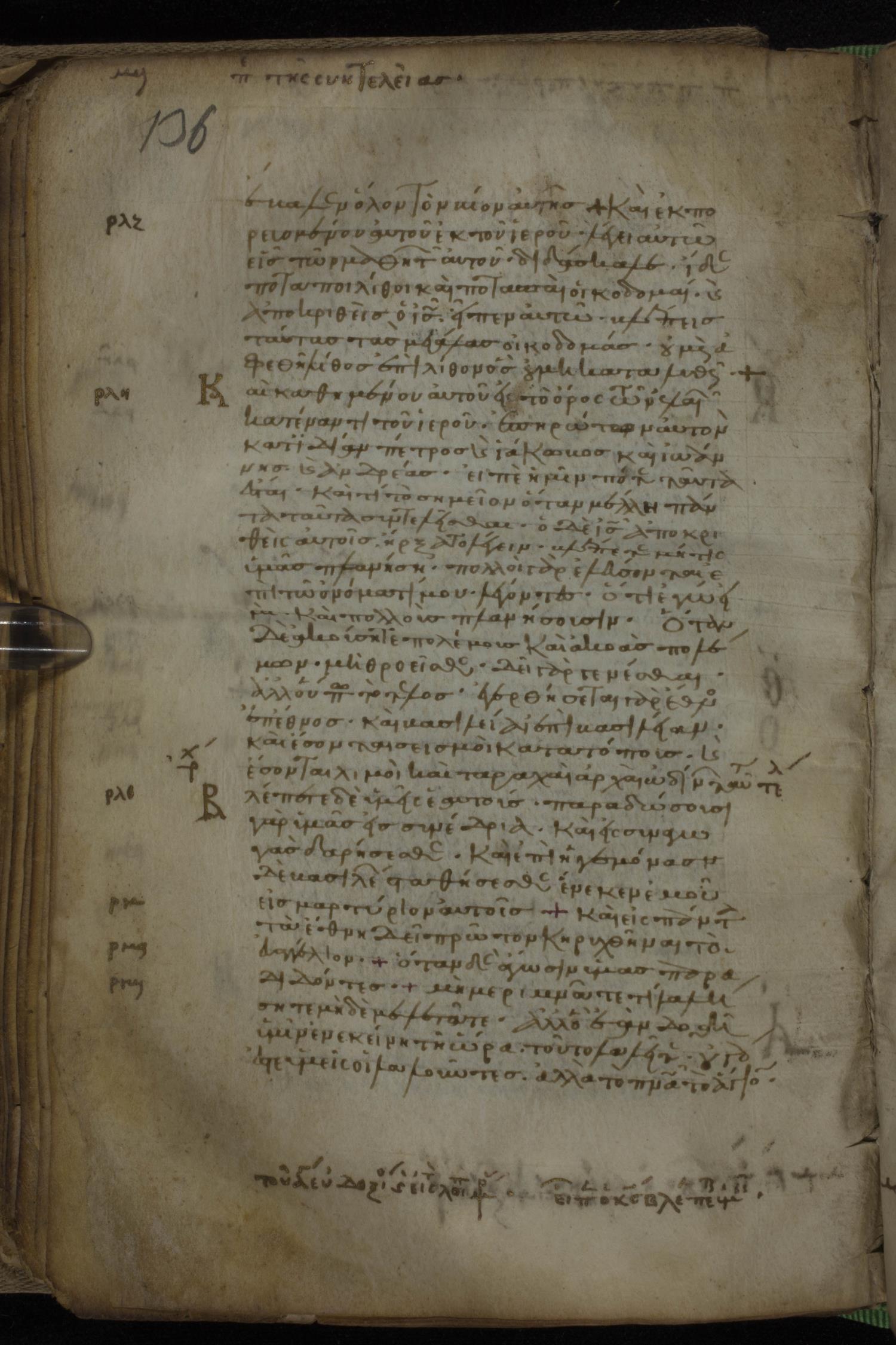 Eleventh century minuscule of the Gospels, the Apostolos, and Paul on parchment; 318 leaves, 1 column, 34 lines per column. Images were taken at the National Library of Greece in Athens.