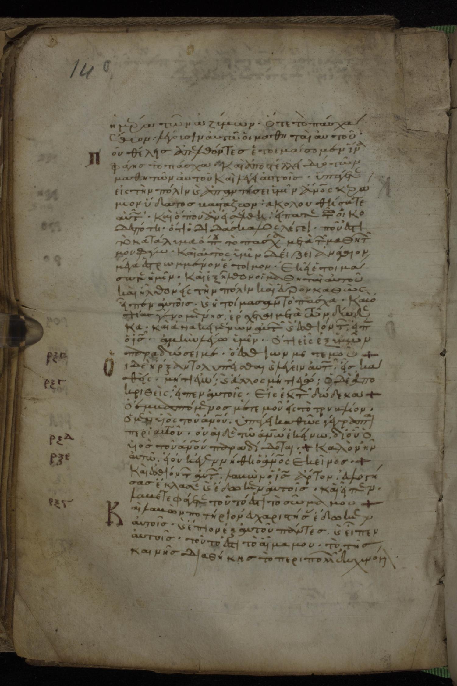 Eleventh century minuscule of the Gospels, the Apostolos, and Paul on parchment; 318 leaves, 1 column, 34 lines per column. Images were taken at the National Library of Greece in Athens.