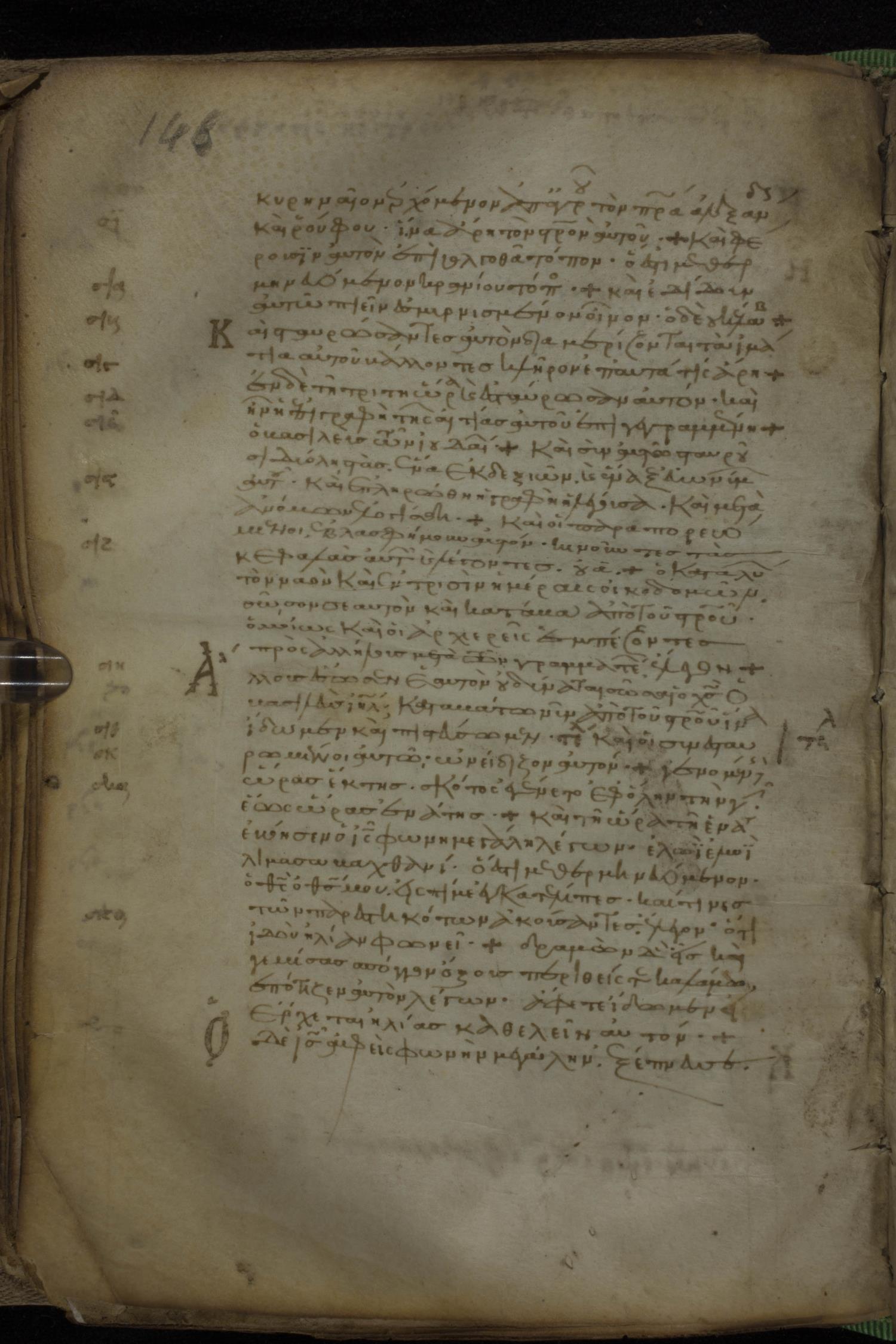 Eleventh century minuscule of the Gospels, the Apostolos, and Paul on parchment; 318 leaves, 1 column, 34 lines per column. Images were taken at the National Library of Greece in Athens.