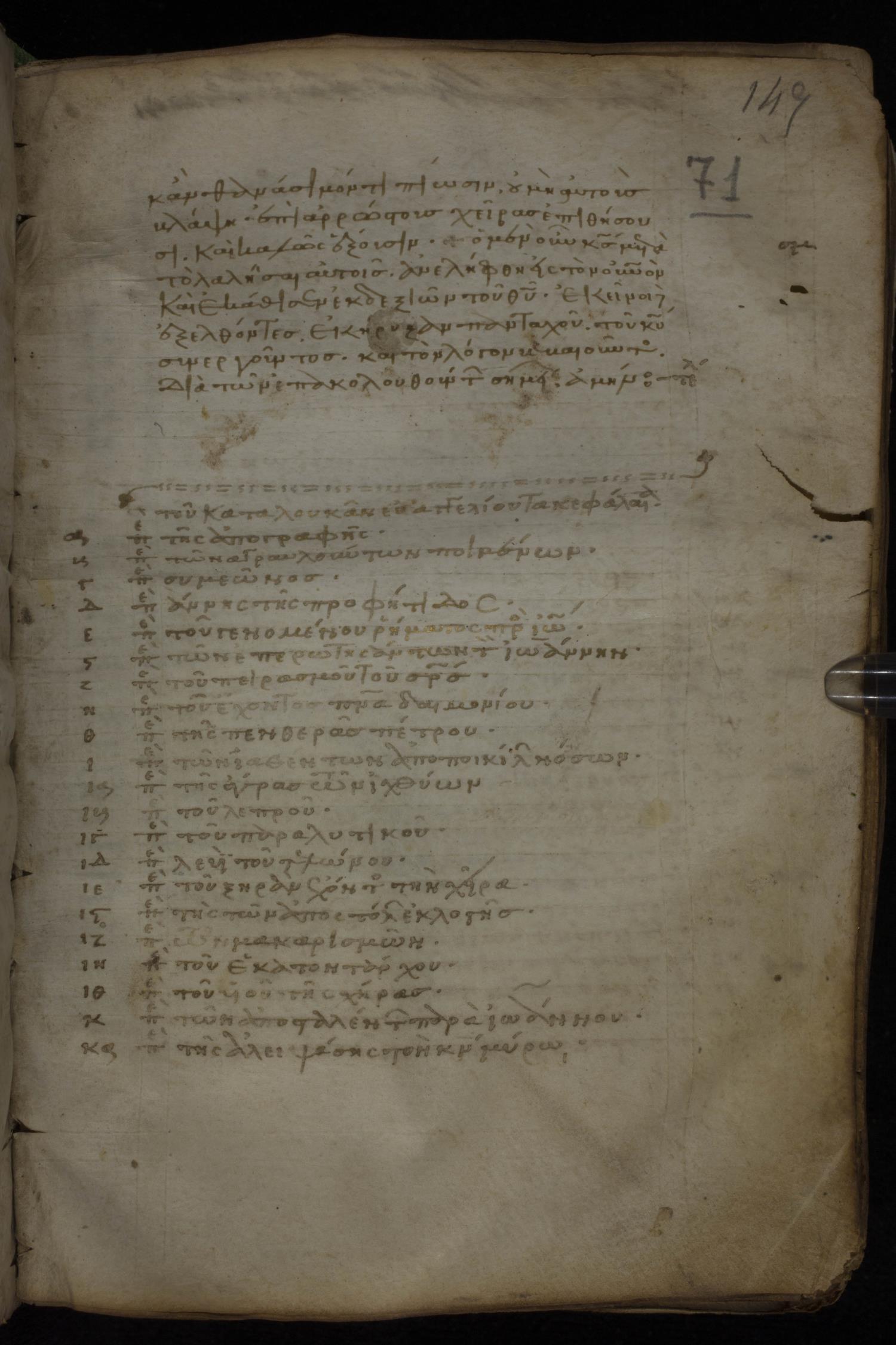 Eleventh century minuscule of the Gospels, the Apostolos, and Paul on parchment; 318 leaves, 1 column, 34 lines per column. Images were taken at the National Library of Greece in Athens.