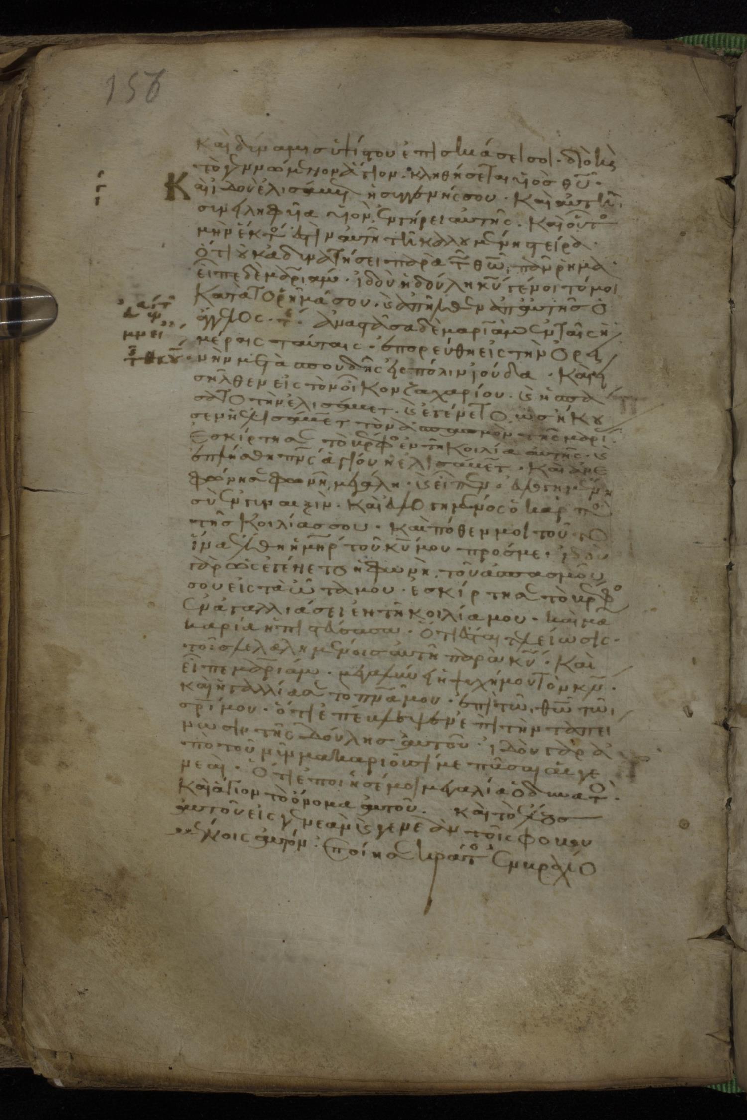Eleventh century minuscule of the Gospels, the Apostolos, and Paul on parchment; 318 leaves, 1 column, 34 lines per column. Images were taken at the National Library of Greece in Athens.