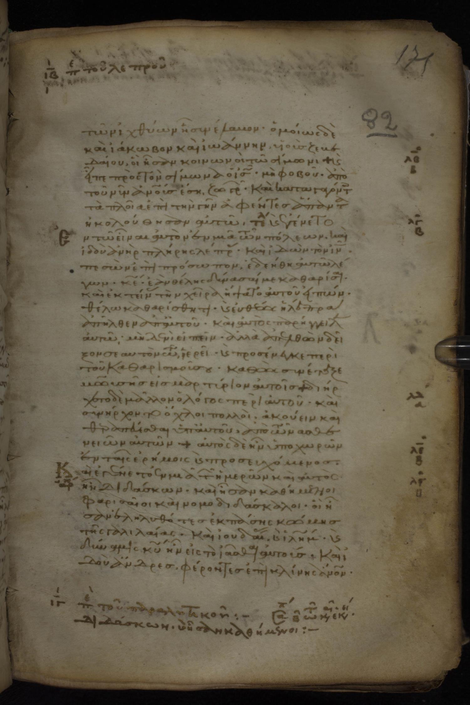 Eleventh century minuscule of the Gospels, the Apostolos, and Paul on parchment; 318 leaves, 1 column, 34 lines per column. Images were taken at the National Library of Greece in Athens.