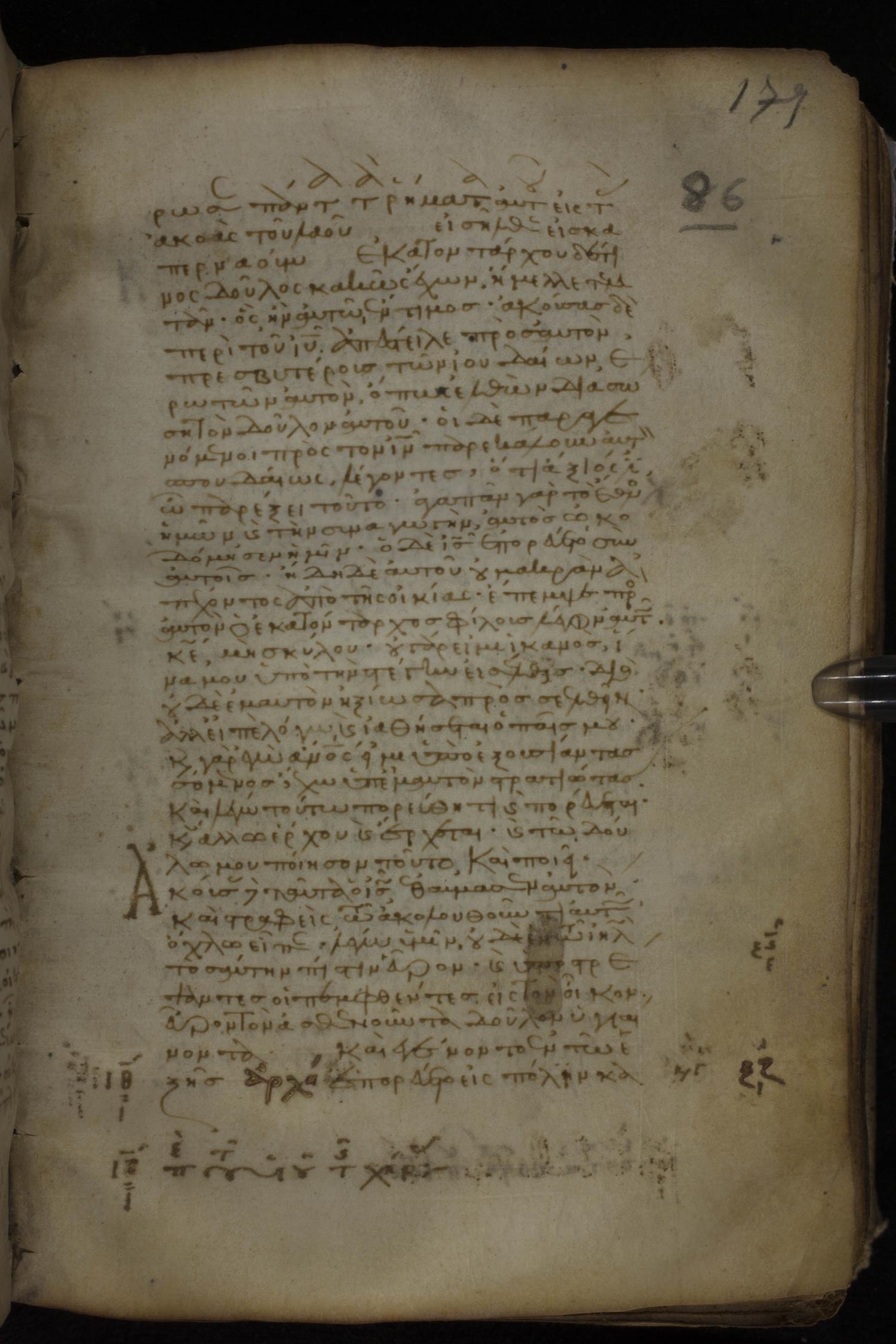 Eleventh century minuscule of the Gospels, the Apostolos, and Paul on parchment; 318 leaves, 1 column, 34 lines per column. Images were taken at the National Library of Greece in Athens.