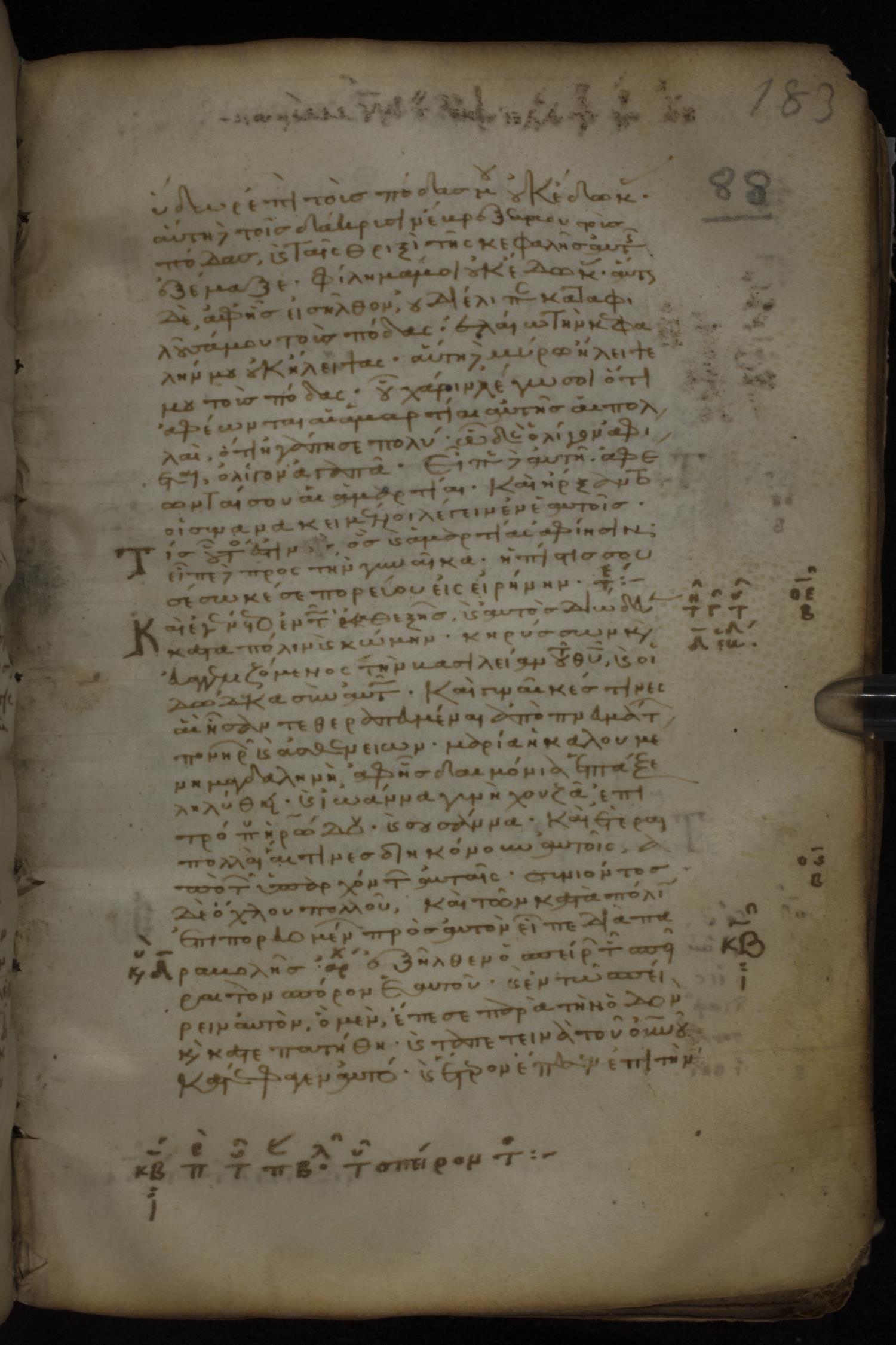 Eleventh century minuscule of the Gospels, the Apostolos, and Paul on parchment; 318 leaves, 1 column, 34 lines per column. Images were taken at the National Library of Greece in Athens.