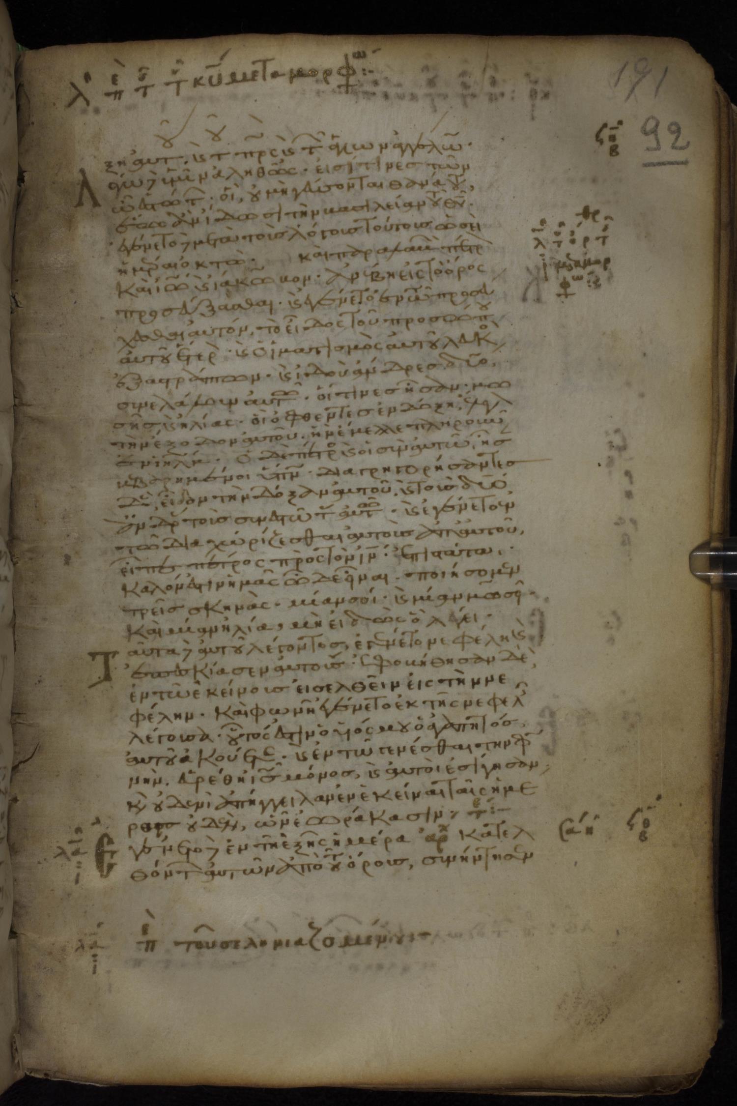 Eleventh century minuscule of the Gospels, the Apostolos, and Paul on parchment; 318 leaves, 1 column, 34 lines per column. Images were taken at the National Library of Greece in Athens.