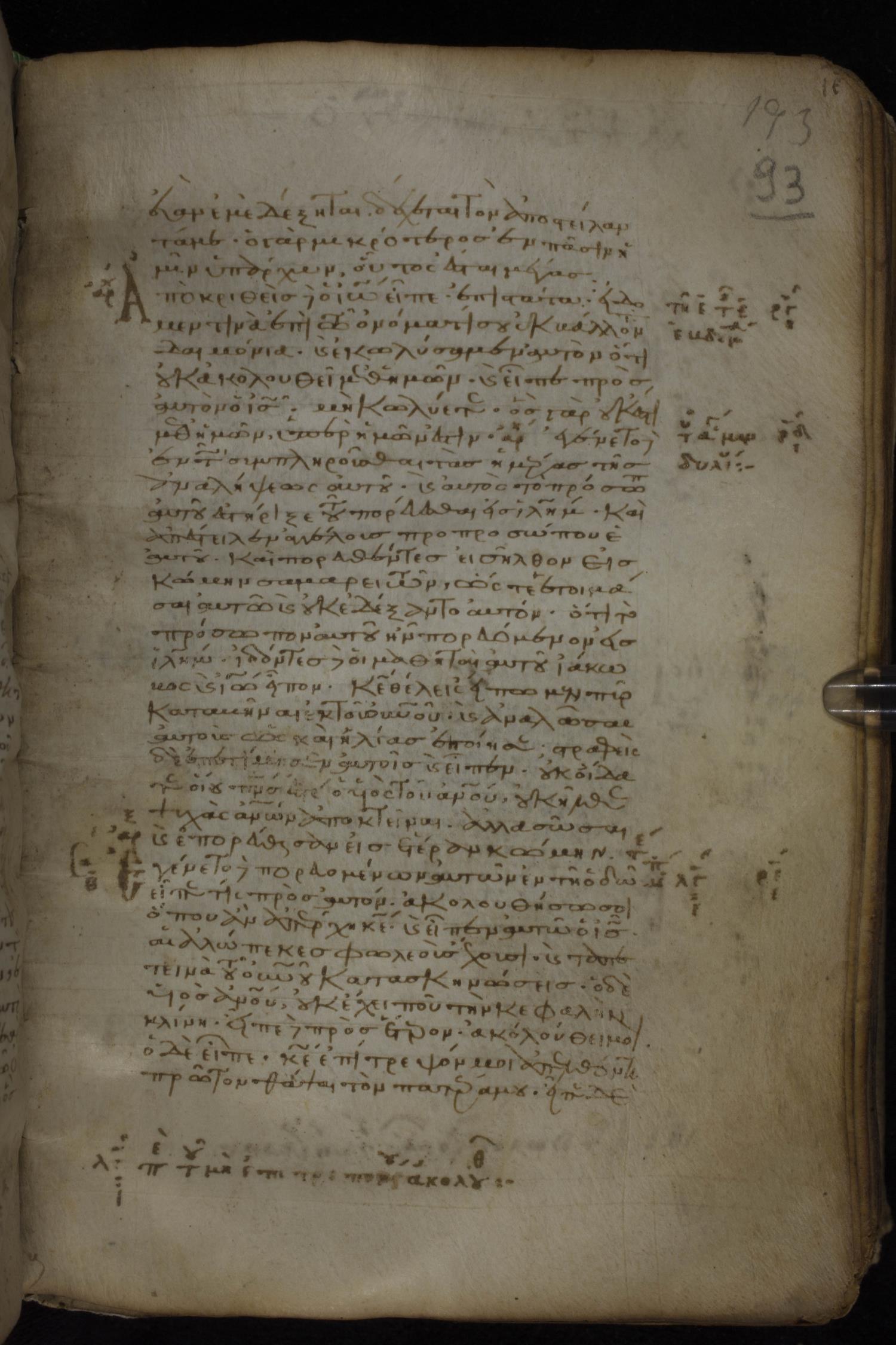 Eleventh century minuscule of the Gospels, the Apostolos, and Paul on parchment; 318 leaves, 1 column, 34 lines per column. Images were taken at the National Library of Greece in Athens.